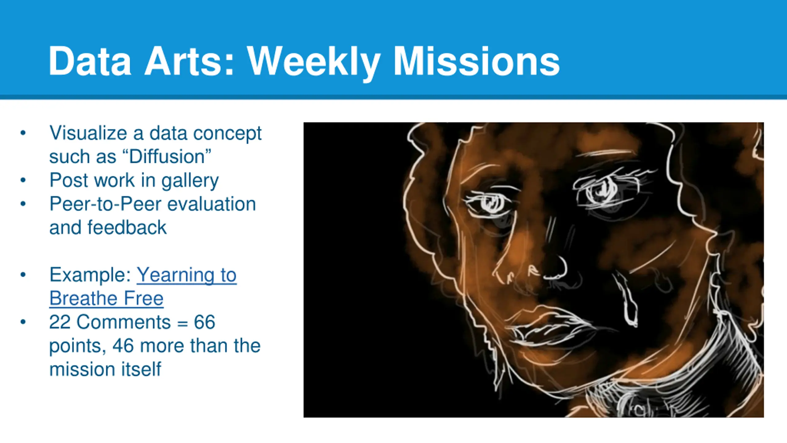 - Data Arts: Weekly Missions Visualize a data concept such as Diffusion Post work in gallery Peer-to-Peer evaluation and feedback Example: Yearning to Breathe Free 22 Comments = 66 points, 46 more than the mission itself