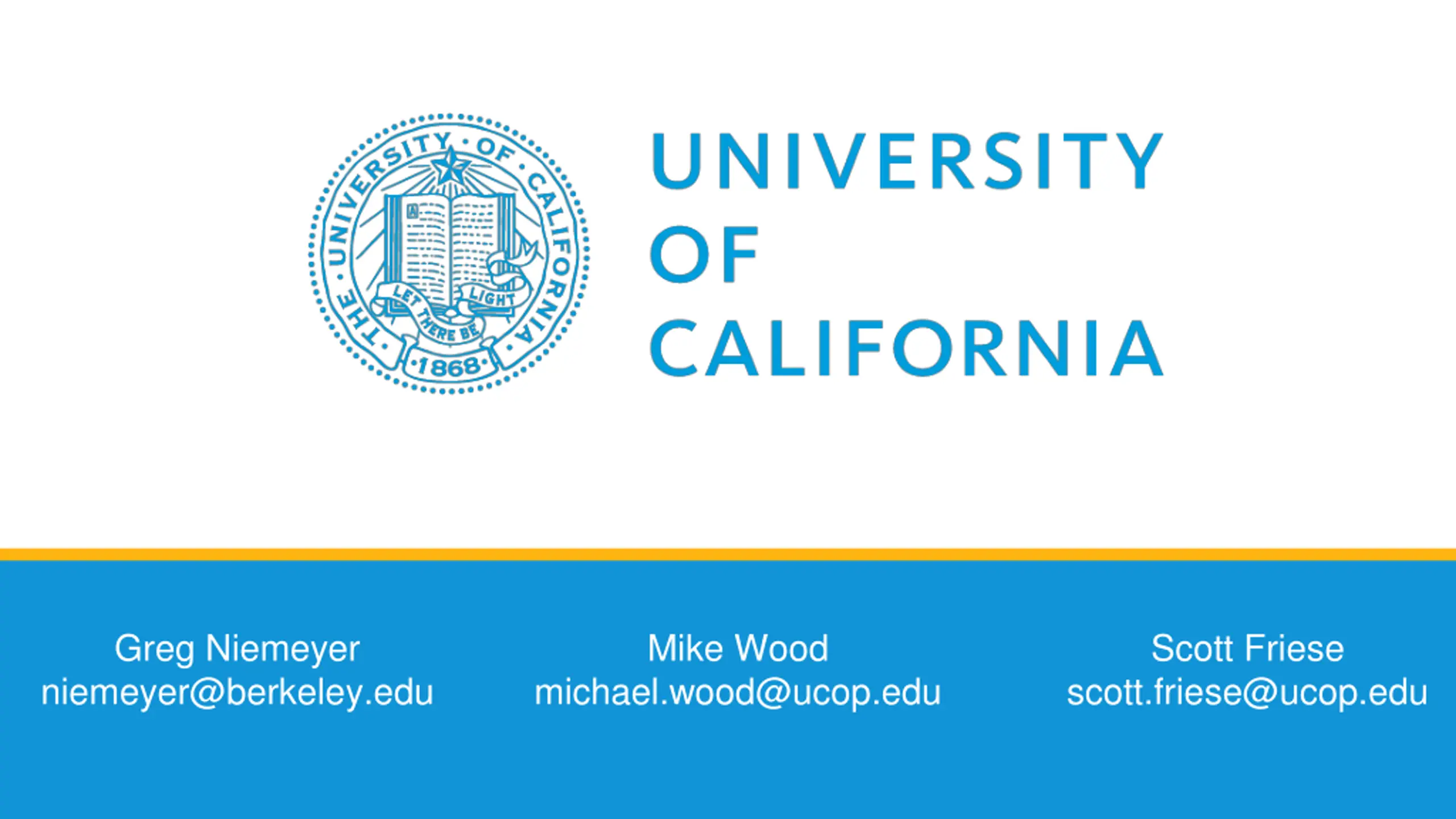 - Greg Niemeyer niemeyer@berkeley.edu Mike Wood Scott Friese scott.friese@ucop.edu michael.wood@ucop.edu