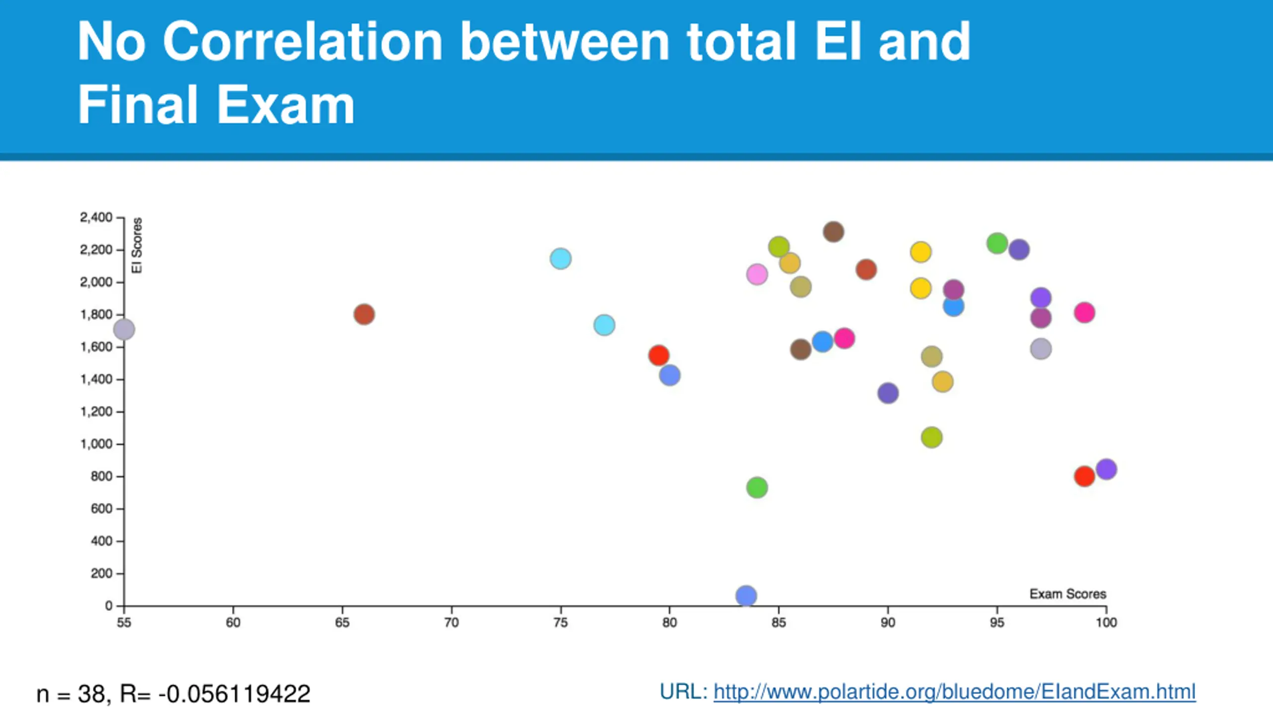 - No Correlation between total EI and Final Exam Ettie Gisela Abigail n = 38, R= -0.056119422 URL: http://www.polartide.org/bluedome/EIandExam.html