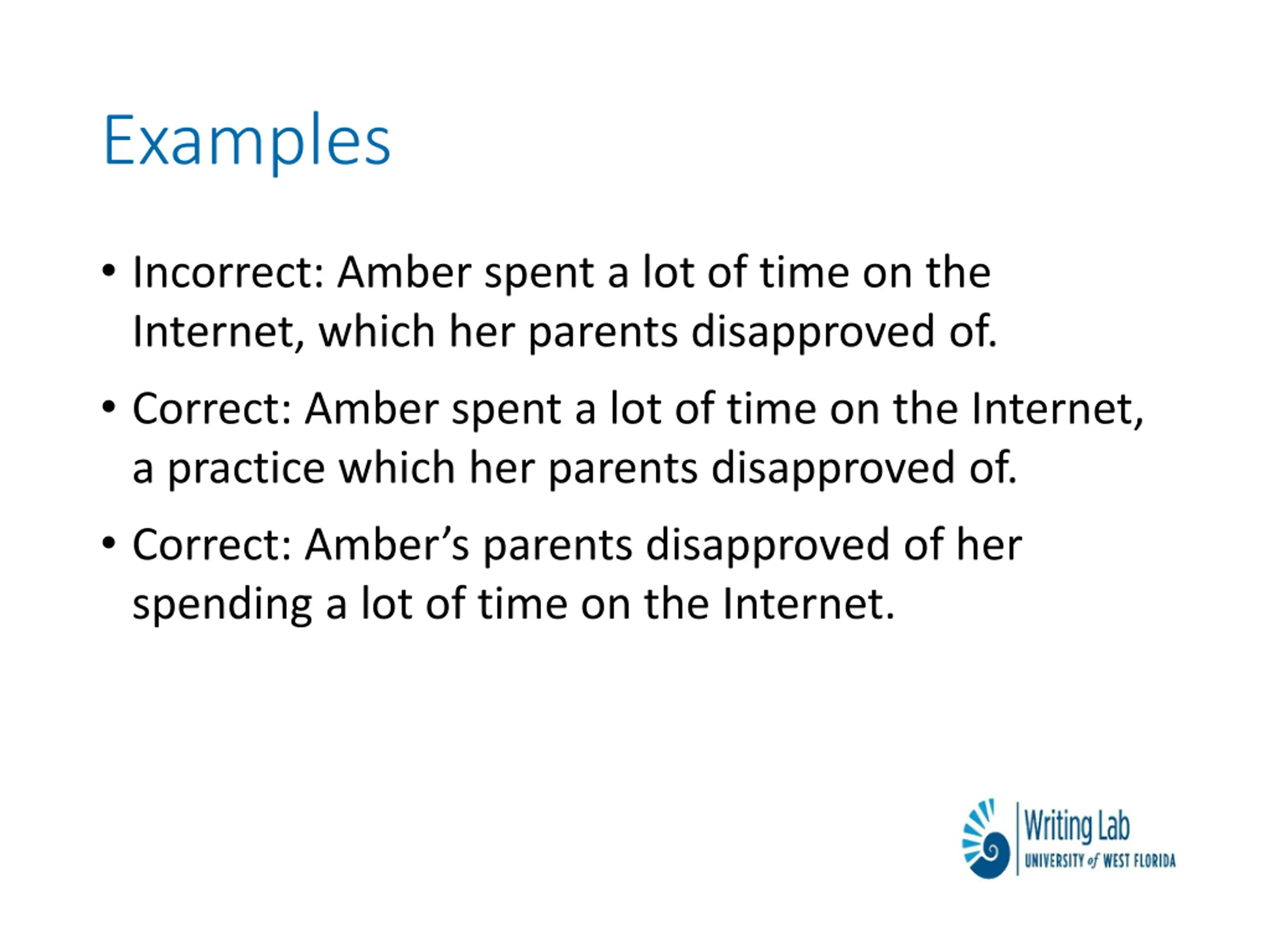 Examples Incorrect: Amber spent a lot of time on the Internet, which her parents disapproved of. Correct: Amber spent a lot of time on the Internet, a practice which her parents disapproved of. Correct: Amber s parents disapproved of her spending a lot of time on the Internet.