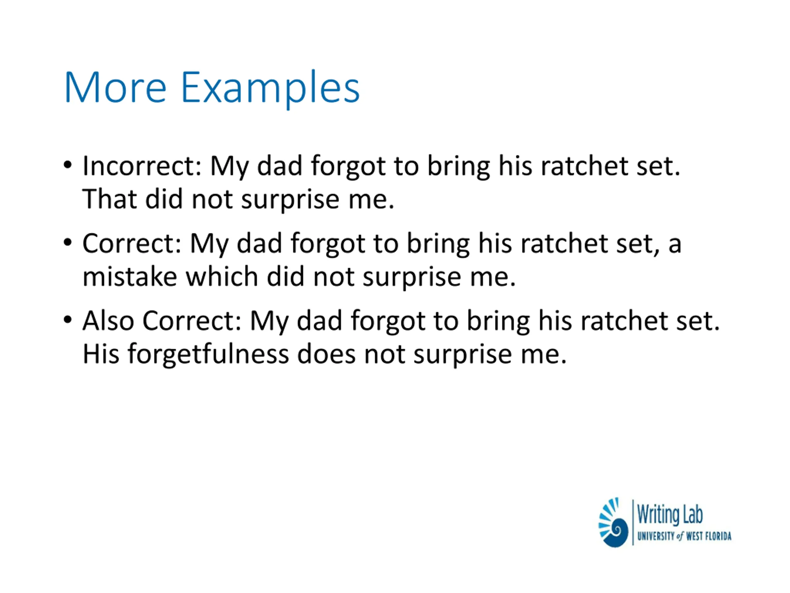 More Examples Incorrect: My dad forgot to bring his ratchet set. That did not surprise me. Correct: My dad forgot to bring his ratchet set, a mistake which did not surprise me. Also Correct: My dad forgot to bring his ratchet set. His forgetfulness does not surprise me.