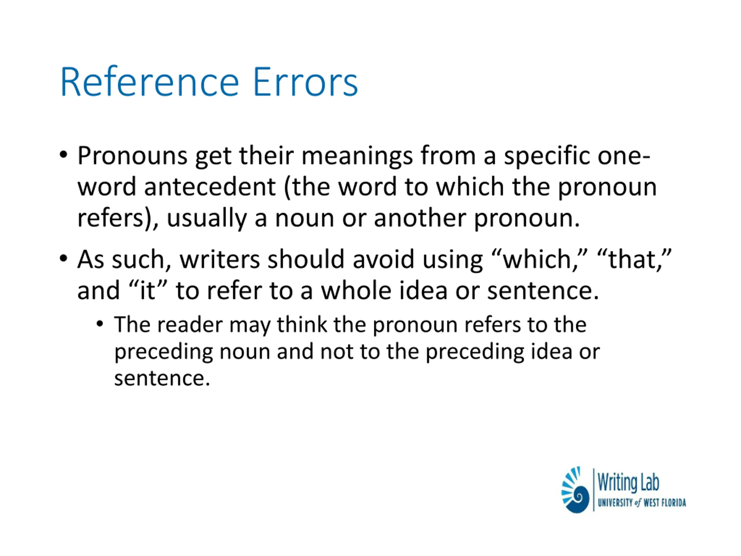 Reference Errors Pronouns get their meanings from a specific one- word antecedent (the word to which the pronoun refers), usually a noun or another pronoun. As such, writers should avoid using which, that, and it to refer to a whole idea or sentence. The reader may think the pronoun refers to the preceding noun and not to the preceding idea or sentence.