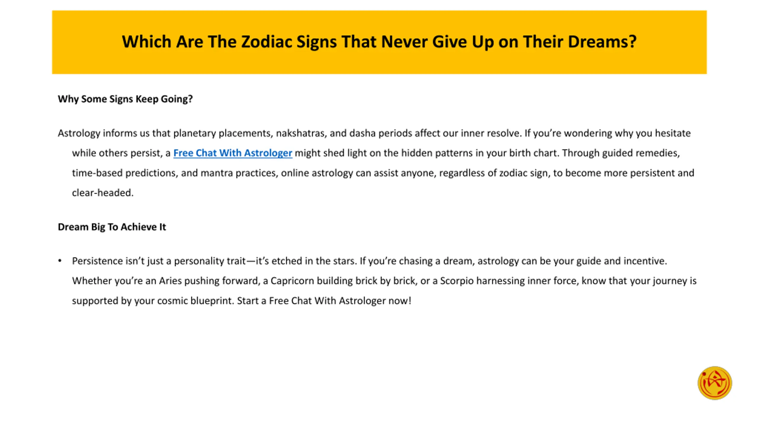 Which Are The Zodiac Signs That Never Give Up on Their Dreams? Why Some Signs Keep Going? Astrology informs us that planetary placements, nakshatras, and dasha periods affect our inner resolve. If you re wondering why you hesitate while others persist, a Free Chat With Astrologer might shed light on the hidden patterns in your birth chart. Through guided remedies, time-based predictions, and mantra practices, online astrology can assist anyone, regardless of zodiac sign, to become more persistent and clear-headed. Dream Big To Achieve It Persistence isn t just a personality trait it s etched in the stars. If you re chasing a dream, astrology can be your guide and incentive. Whether you re an Aries pushing forward, a Capricorn building brick by brick, or a Scorpio harnessing inner force, know that your journey is supported by your cosmic blueprint. Start a Free Chat With Astrologer now!