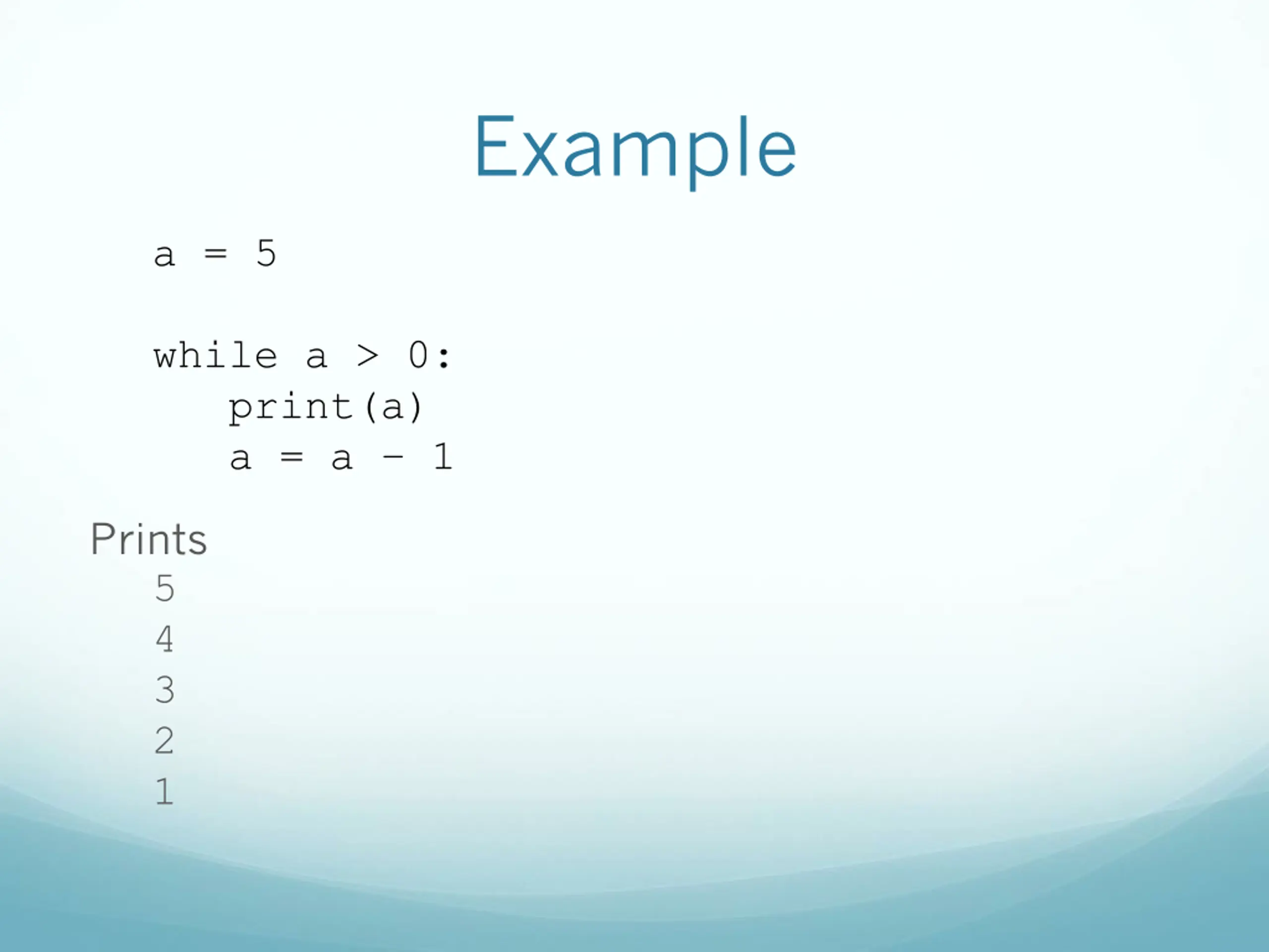 Example a = 5 while a > 0: print(a) a = a 1 Prints 5 4 3 2 1