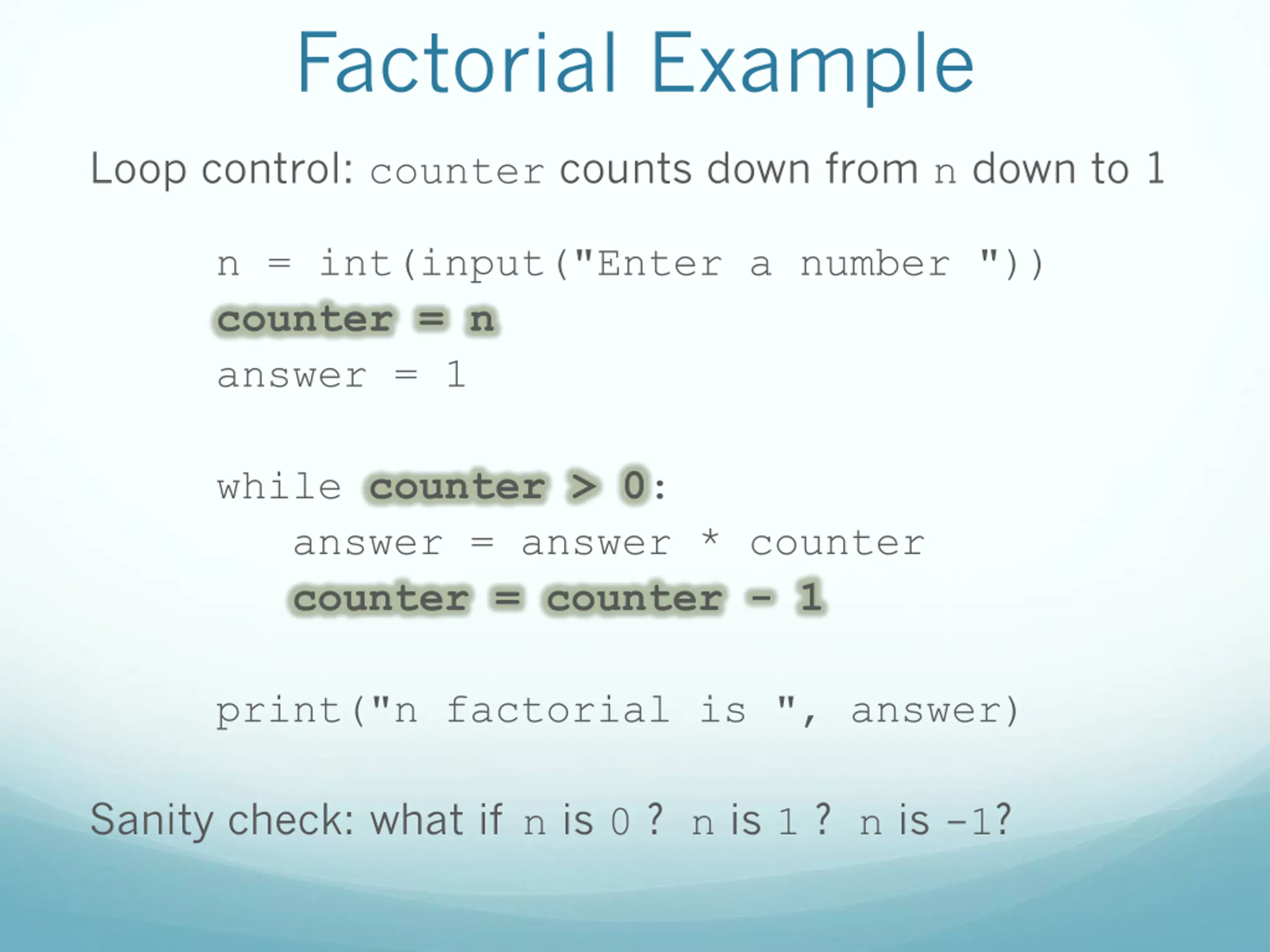 Factorial Example Loop control: counter counts down from n down to 1 n = int(input("Enter a number ")) counter = n answer = 1 while counter > 0: answer = answer * counter counter = counter - 1 print("n factorial is ", answer) Sanity check: what if n is 0 ? n is 1 ? n is -1?