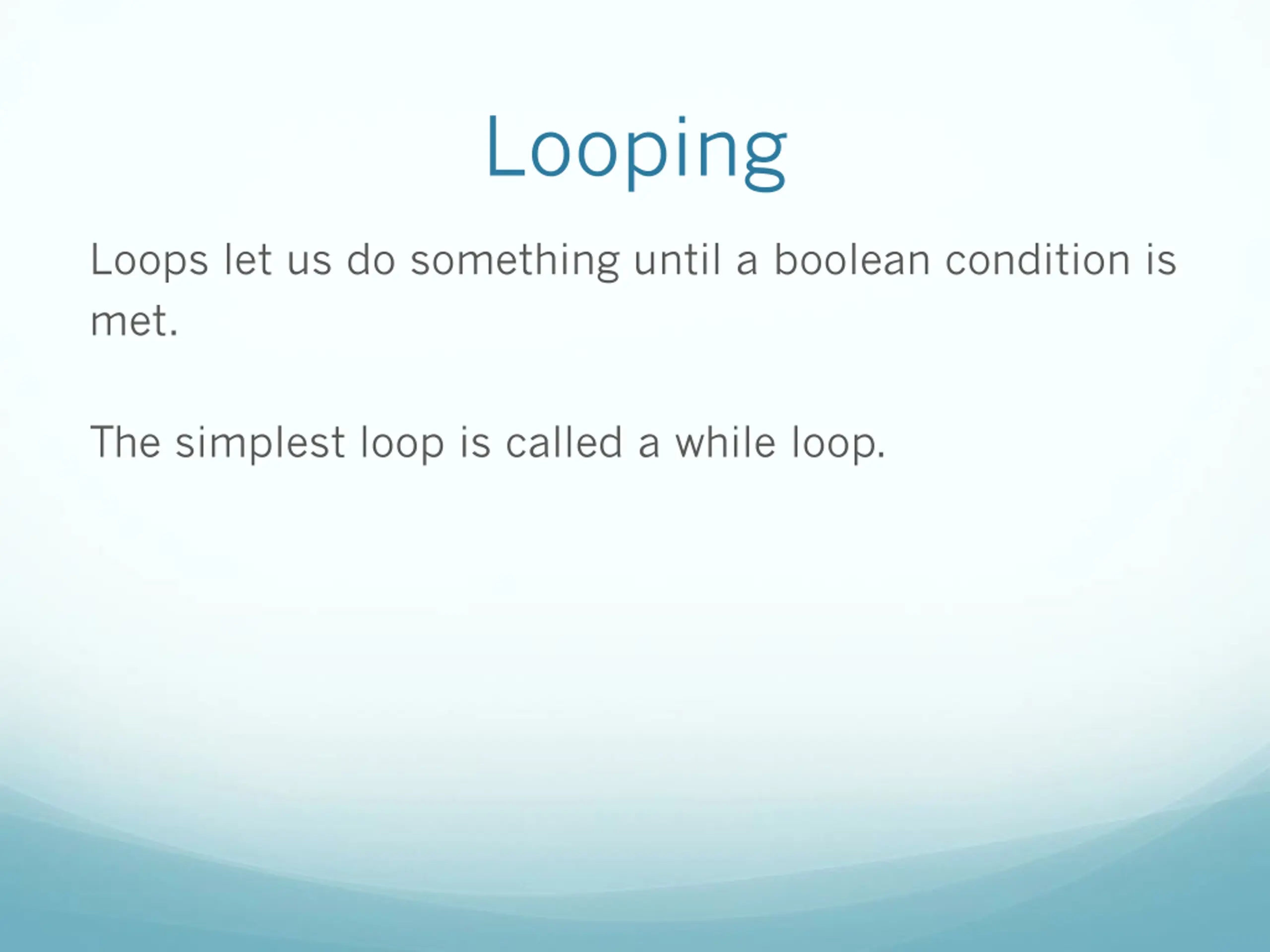 Looping Loops let us do something until a boolean condition is met. The simplest loop is called a while loop.