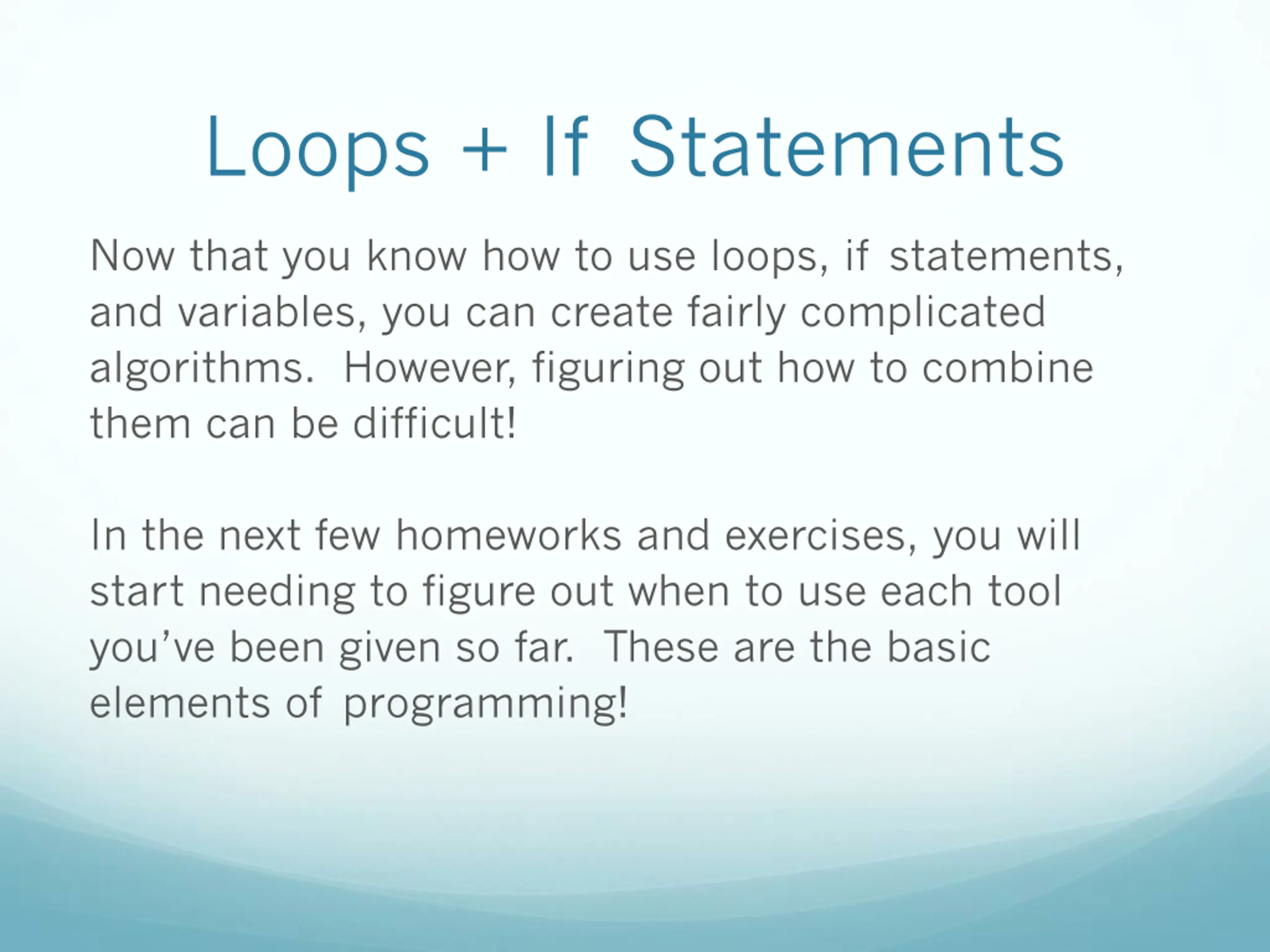 Loops + If Statements Now that you know how to use loops, if statements, and variables, you can create fairly complicated algorithms. However, figuring out how to combine them can be difficult! In the next few homeworks and exercises, you will start needing to figure out when to use each tool you ve been given so far. These are the basic elements of programming!