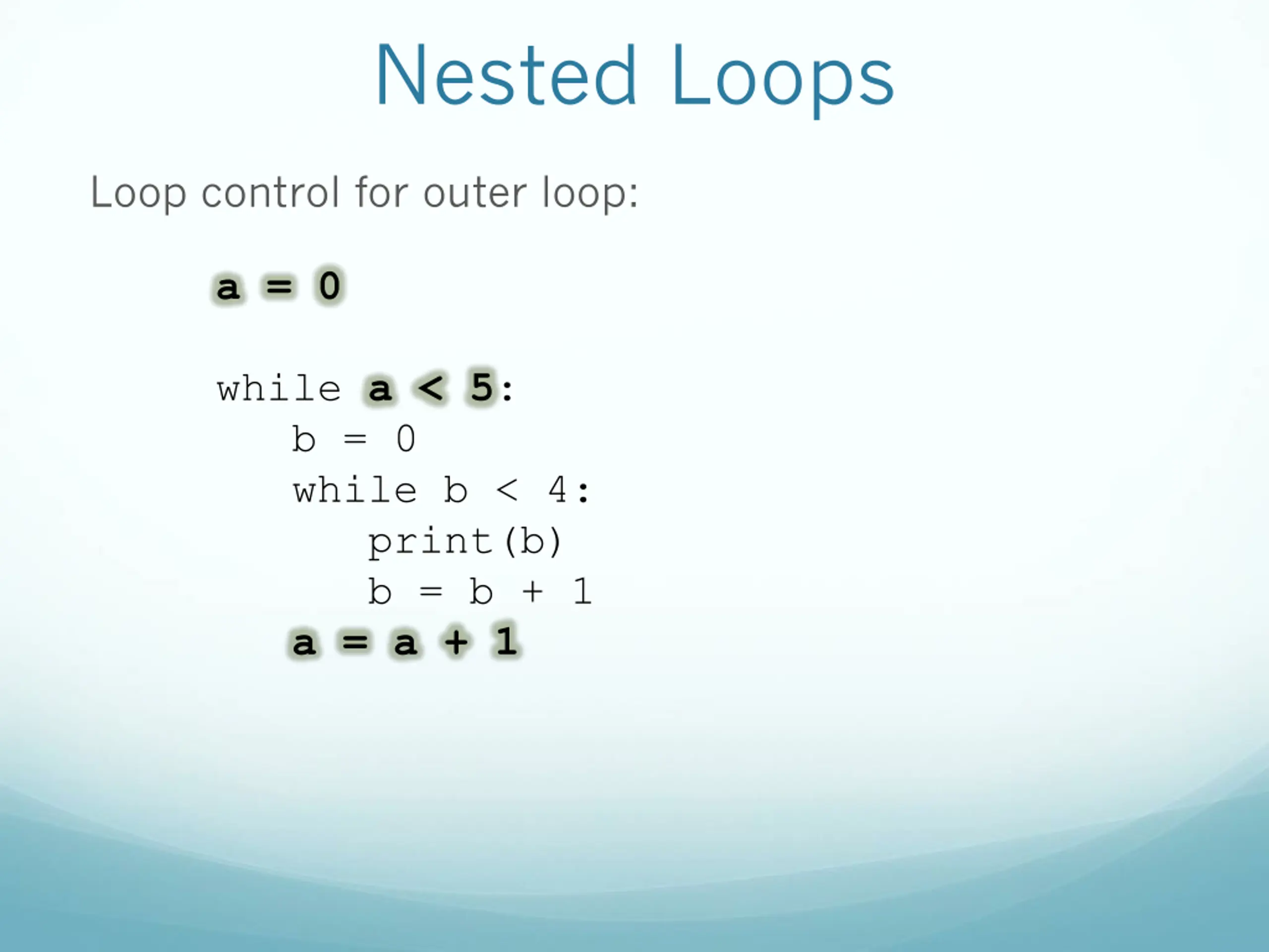 Nested Loops Loop control for outer loop: a = 0 while a < 5: b = 0 while b < 4: print(b) b = b + 1 a = a + 1