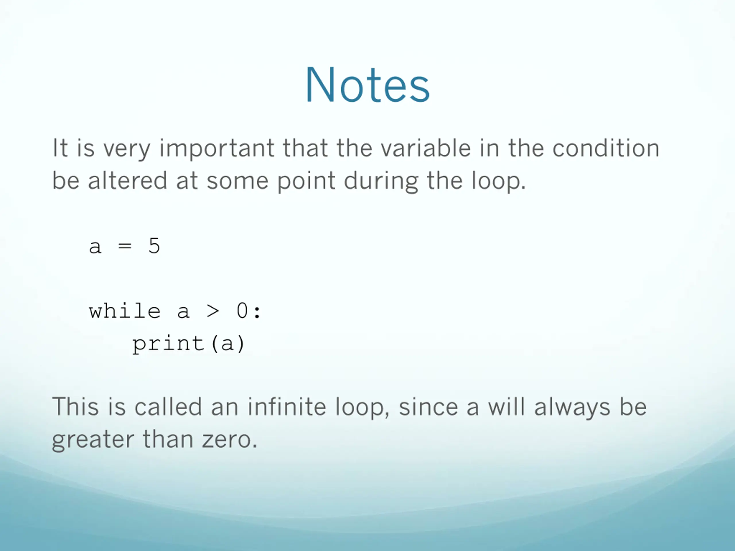 Notes It is very important that the variable in the condition be altered at some point during the loop. a = 5 while a > 0: print(a) This is called an infinite loop, since a will always be greater than zero.
