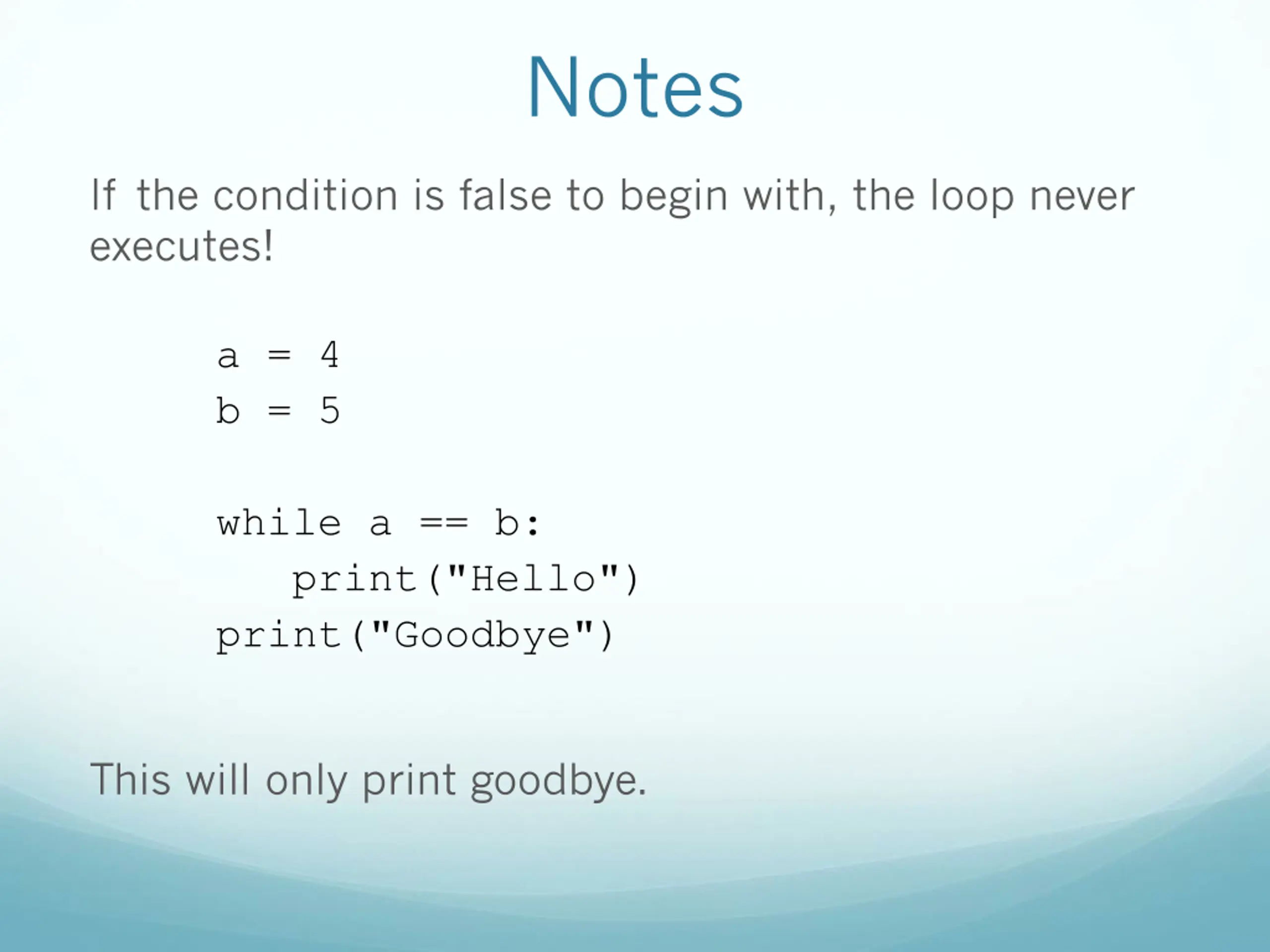 Notes If the condition is false to begin with, the loop never executes! a = 4 b = 5 while a == b: print("Hello") print("Goodbye") This will only print goodbye.