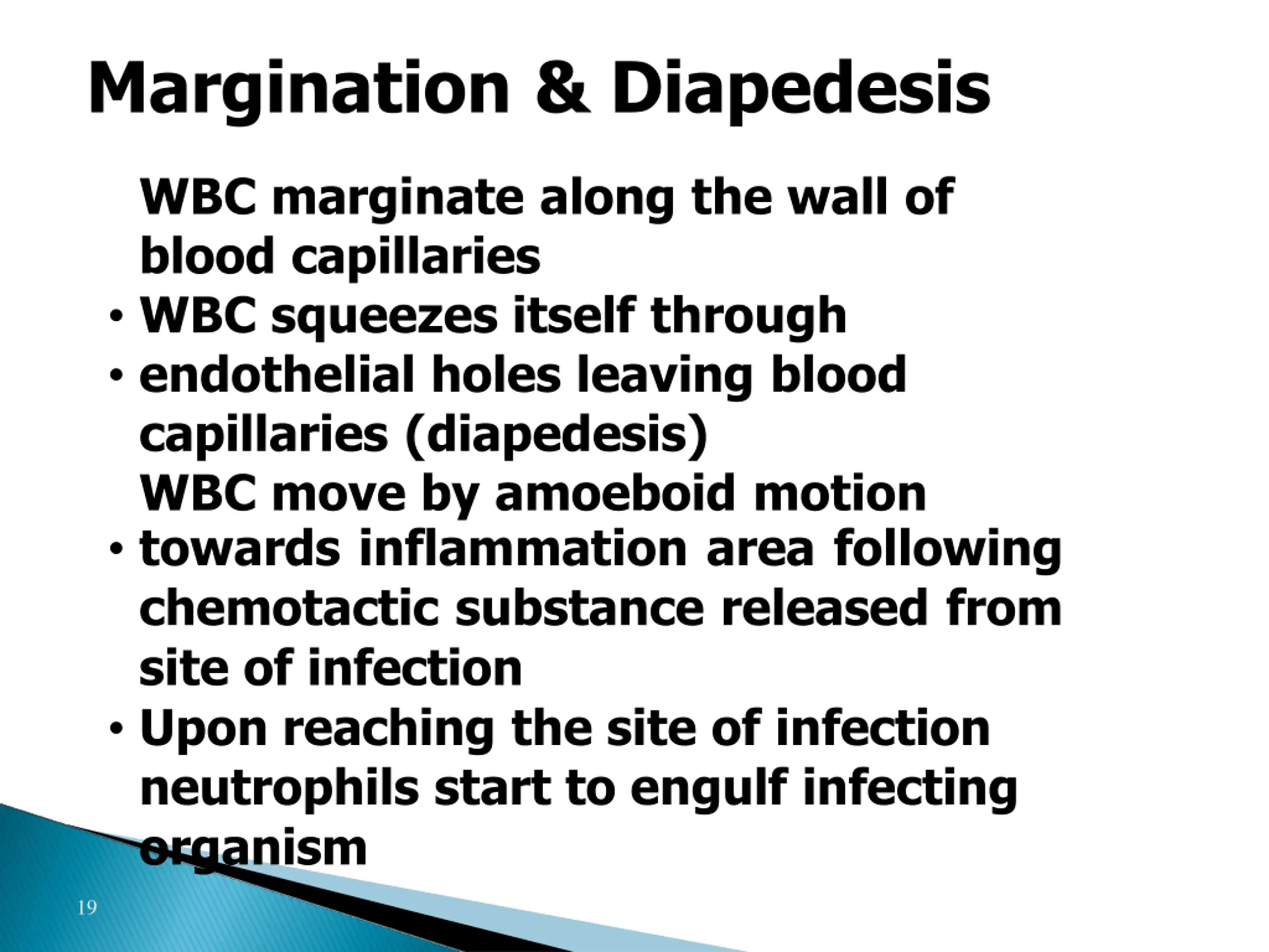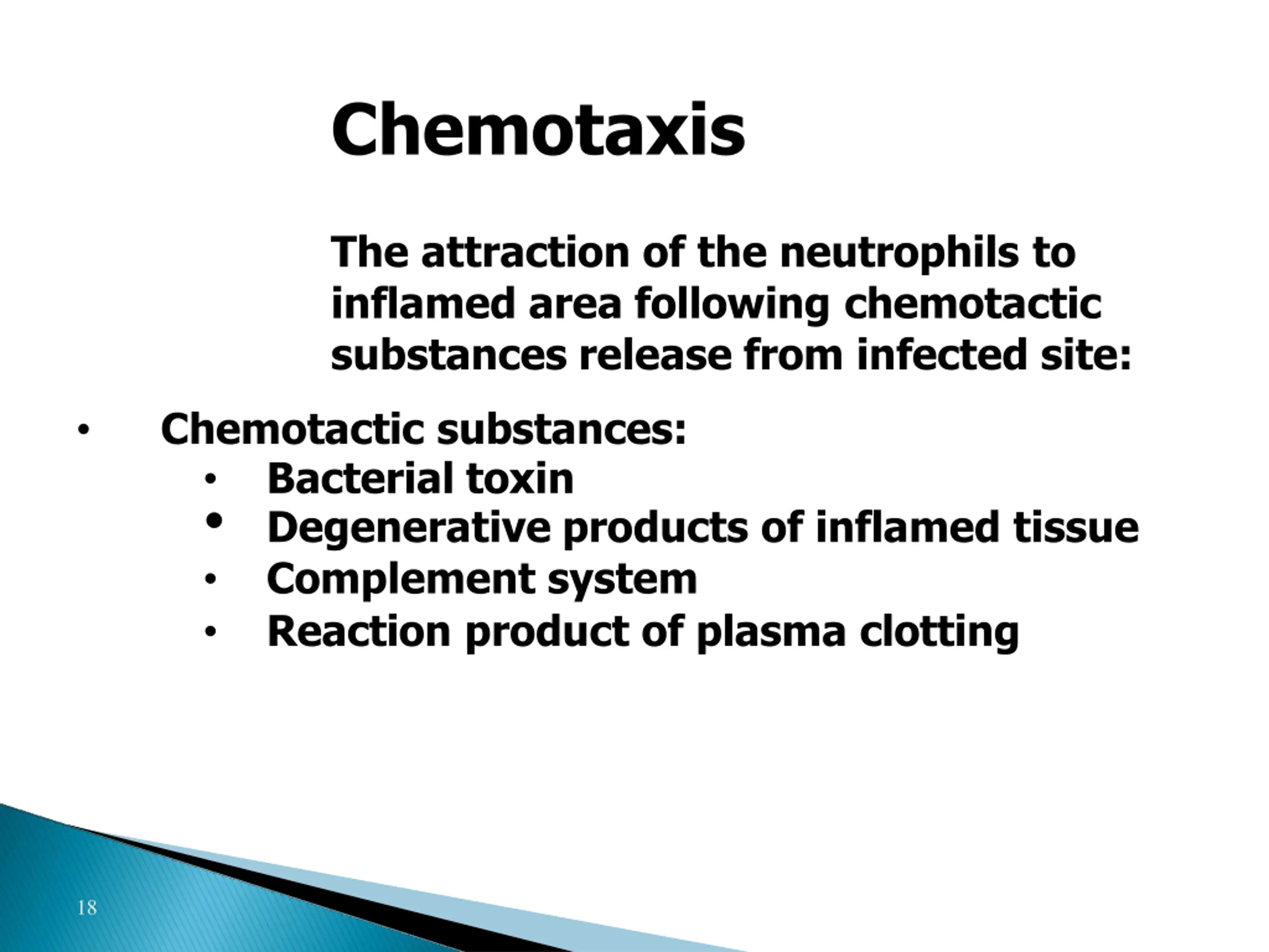 Chemotaxis The attraction of the neutrophils to inflamed area following chemotactic substances release from infected site: Chemotactic substances: Bacterial toxin Degenerative products of inflamed tissue Complement system Reaction product of plasma clotting 18