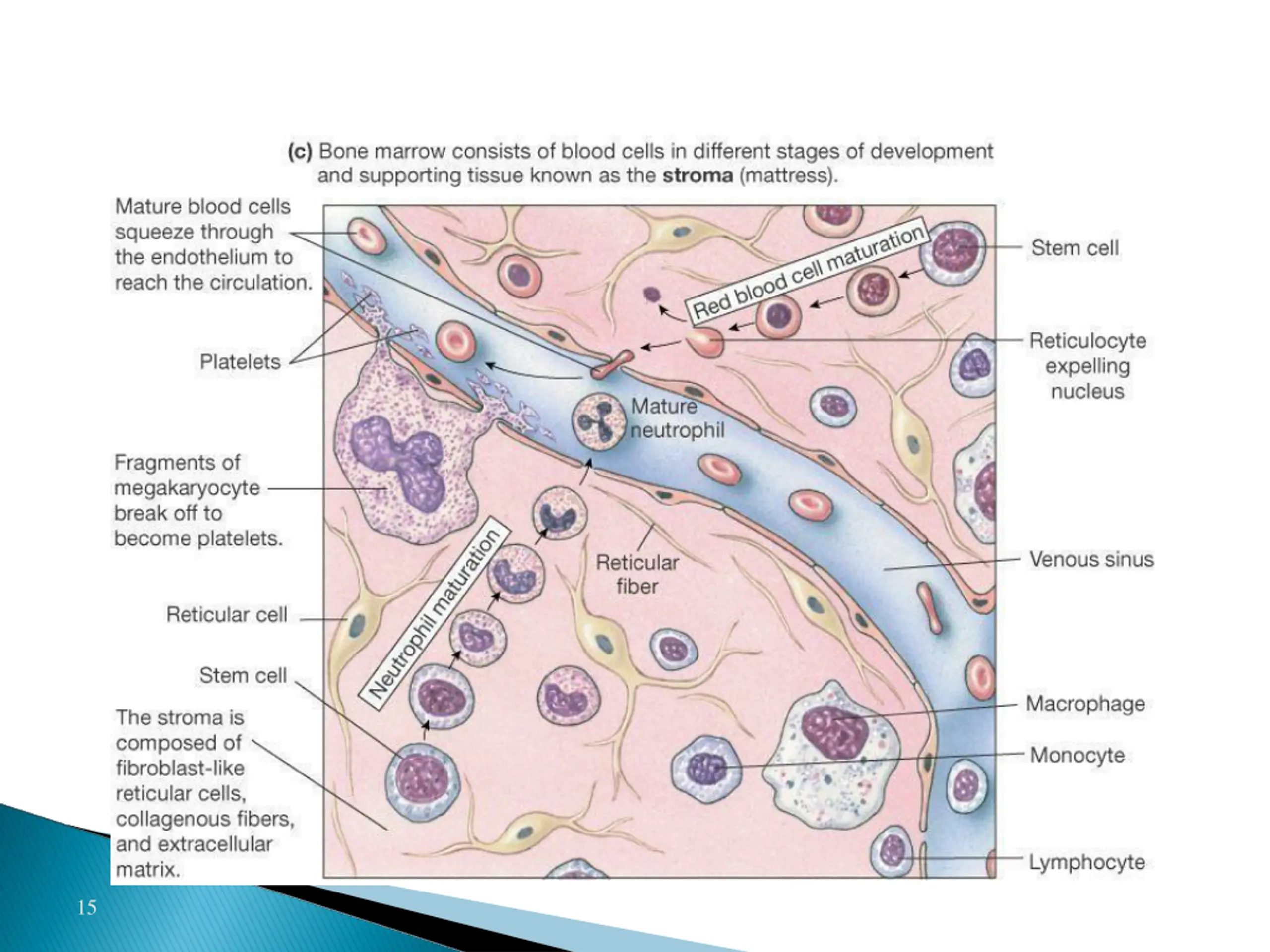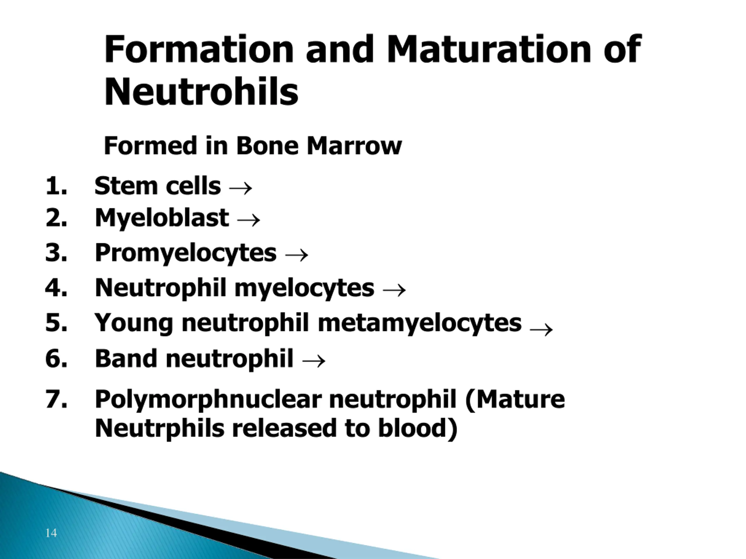 Formation and Maturation of Neutrohils Formed in Bone Marrow Stem cells Myeloblast Promyelocytes Neutrophil myelocytes Young neutrophil metamyelocytes Band neutrophil Polymorphnuclear neutrophil (Mature Neutrphils released to blood) 1. 2. 3. 4. 5. 6. 7. 14