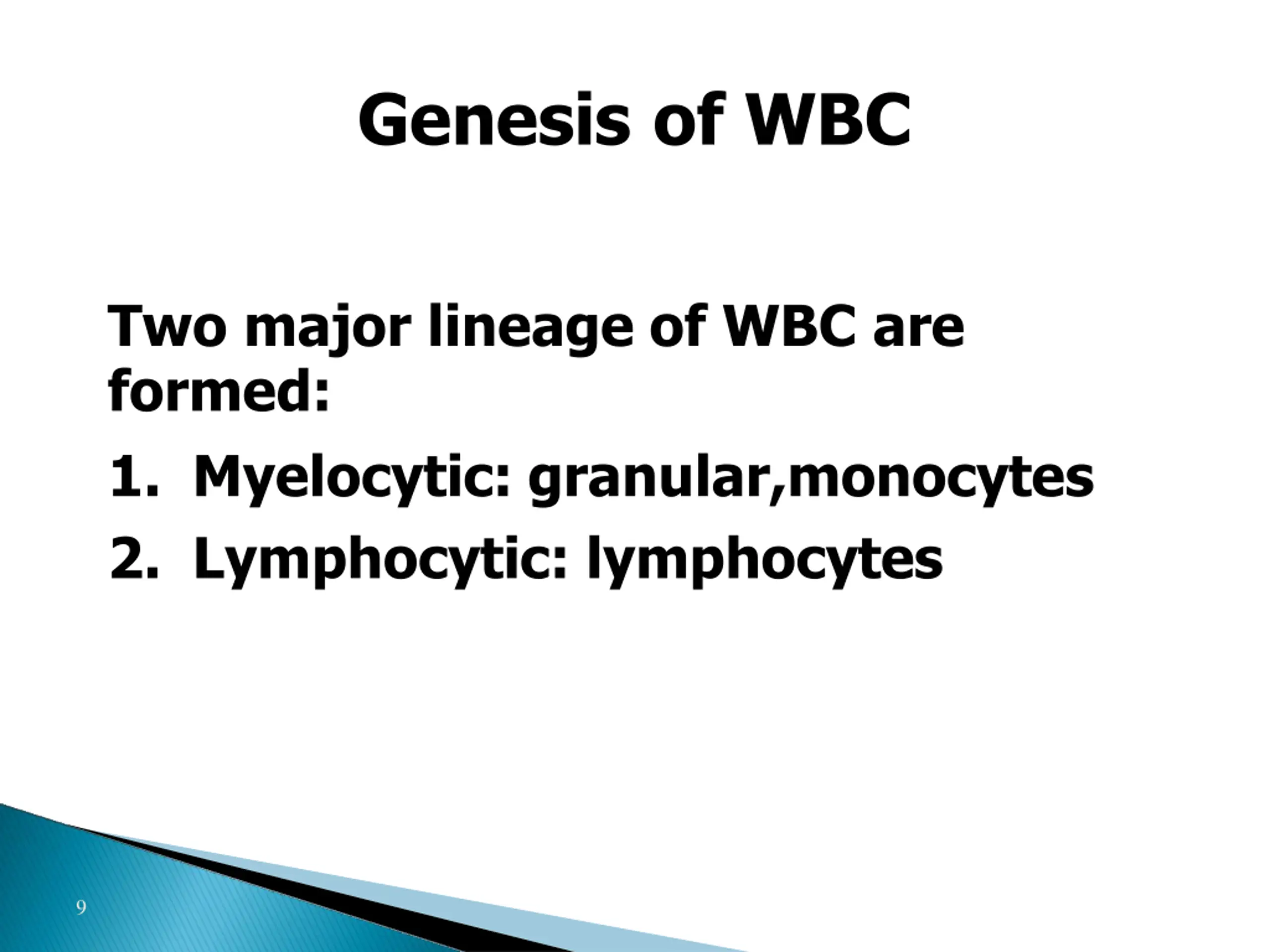 Genesis of WBC Two major lineage of WBC are formed: 1. Myelocytic: granular,monocytes 2. Lymphocytic: lymphocytes 9