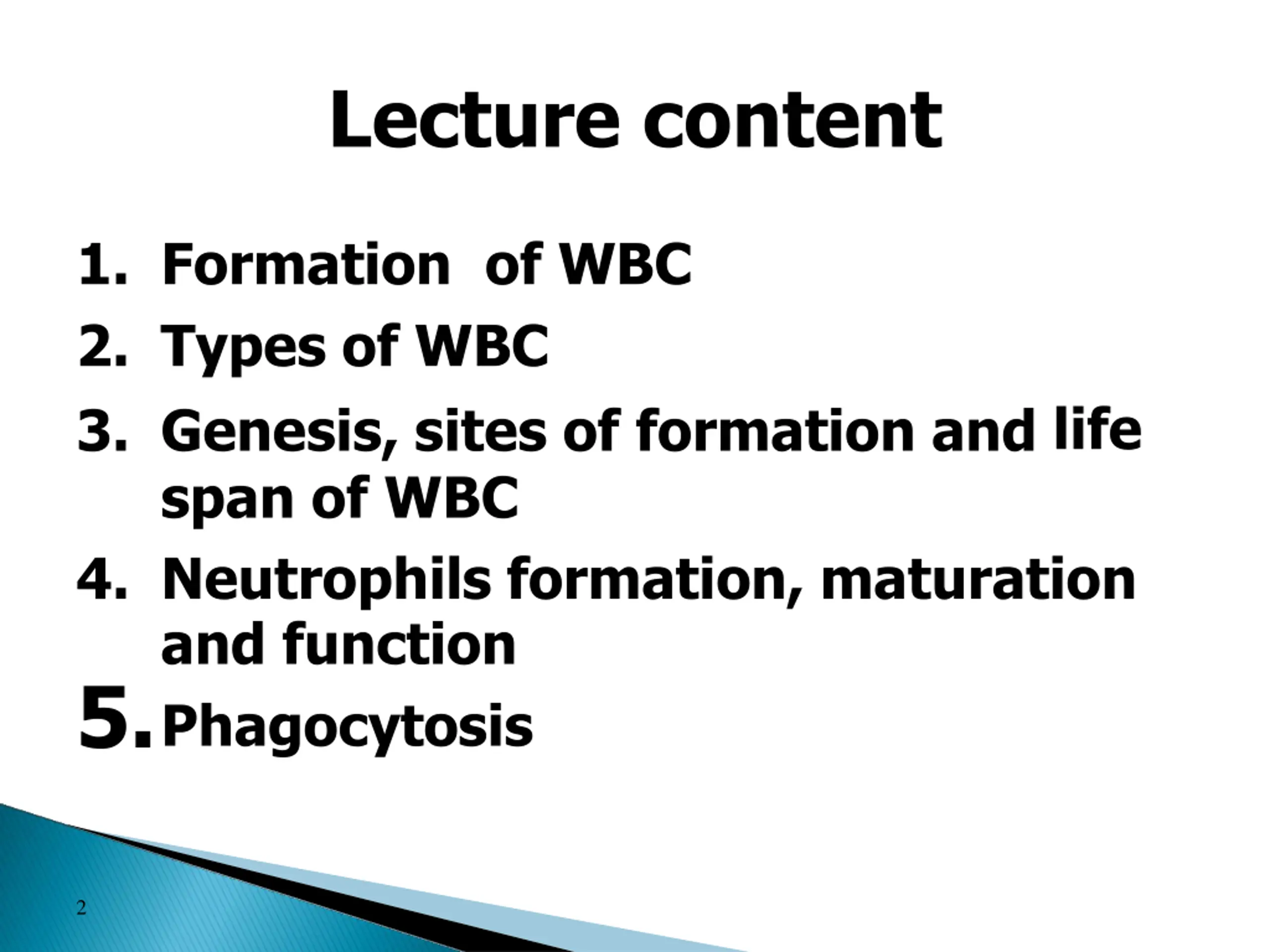 Lecture content 1. Formation of WBC 2. Types of WBC 3. Genesis, sites of formation and life span of WBC 4. Neutrophils formation, maturation and function 5.Phagocytosis 2