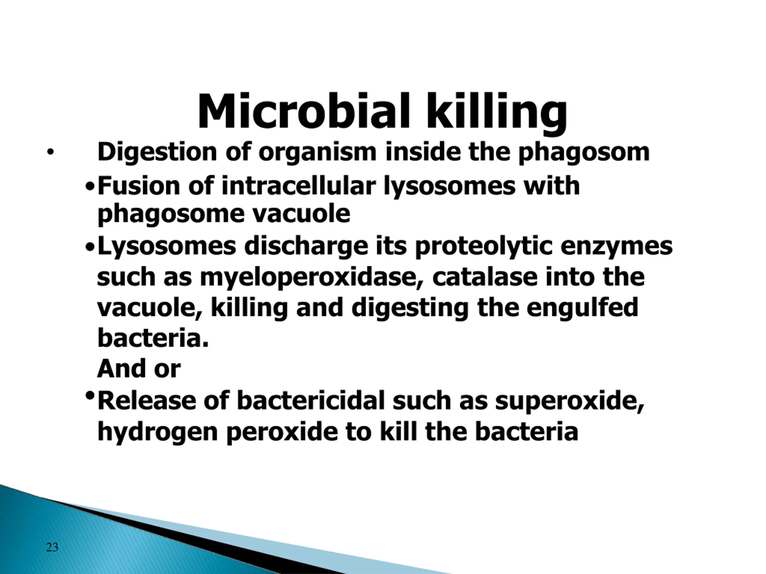 Microbial killing Digestion of organism inside the phagosom Fusion of intracellular lysosomes with phagosome vacuole Lysosomes discharge its proteolytic enzymes such as myeloperoxidase, catalase into the vacuole, killing and digesting the engulfed bacteria. And or Release of bactericidal such as superoxide, hydrogen peroxide to kill the bacteria 23