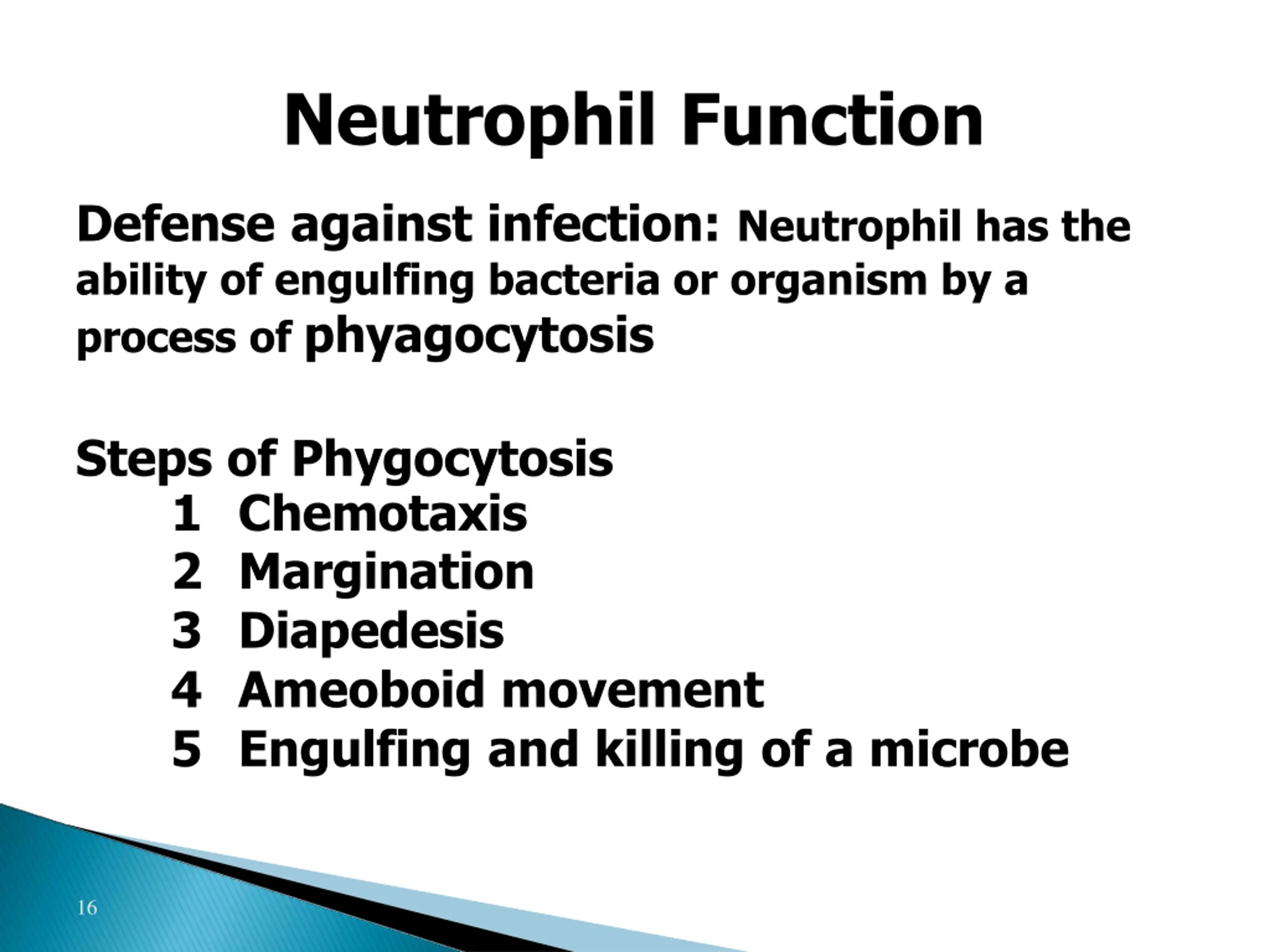 Neutrophil Function Defense against infection: Neutrophil has the ability of engulfing bacteria or organism by a process of phyagocytosis Steps of Phygocytosis 1 Chemotaxis 2 Margination 3 Diapedesis 4 Ameoboid movement 5 Engulfing and killing of a microbe 16