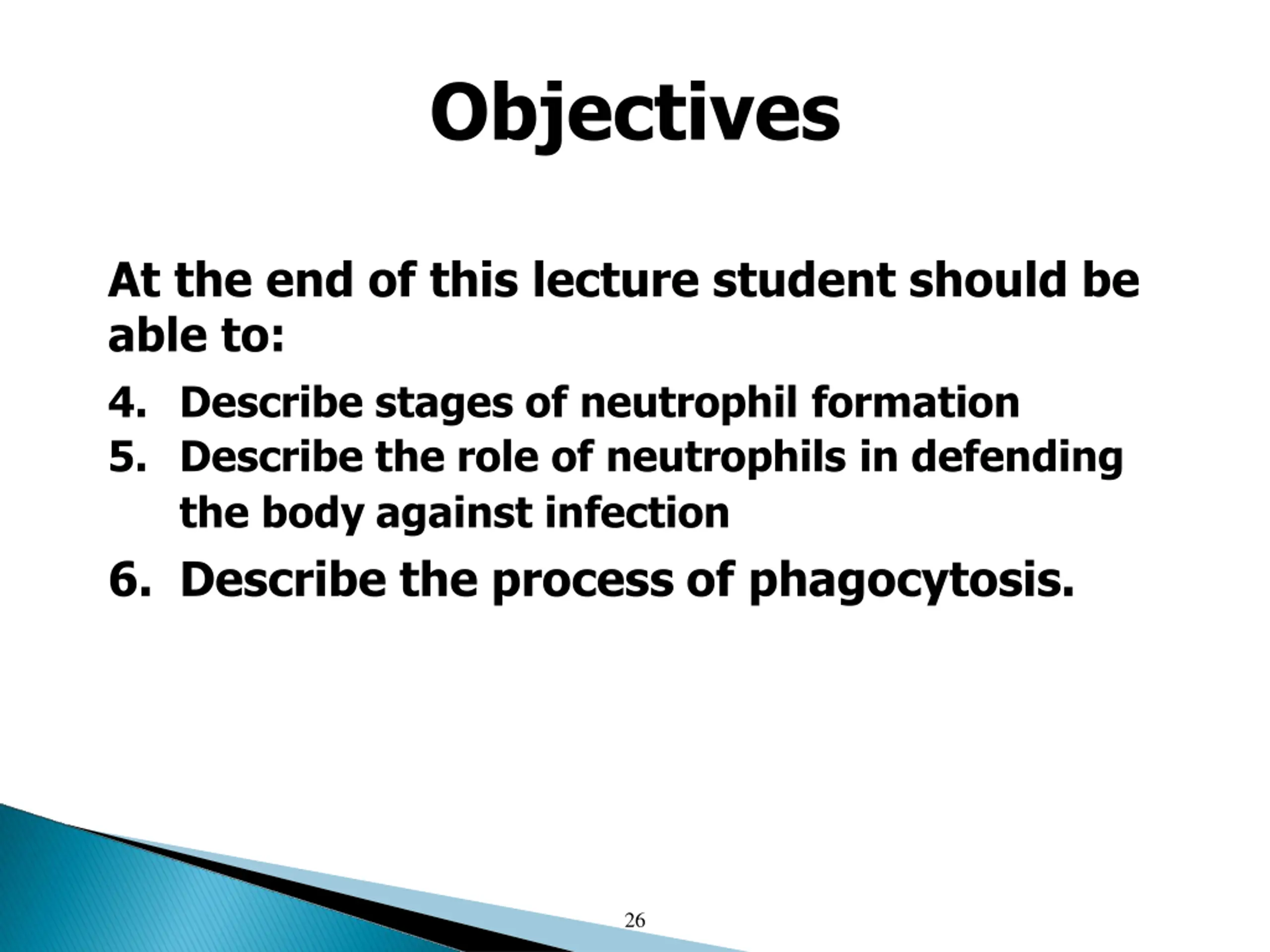 Objectives At the end of this lecture student should be able to: 4. Describe stages of neutrophil formation 5. Describe the role of neutrophils in defending the body against infection 6. Describe the process of phagocytosis. 26