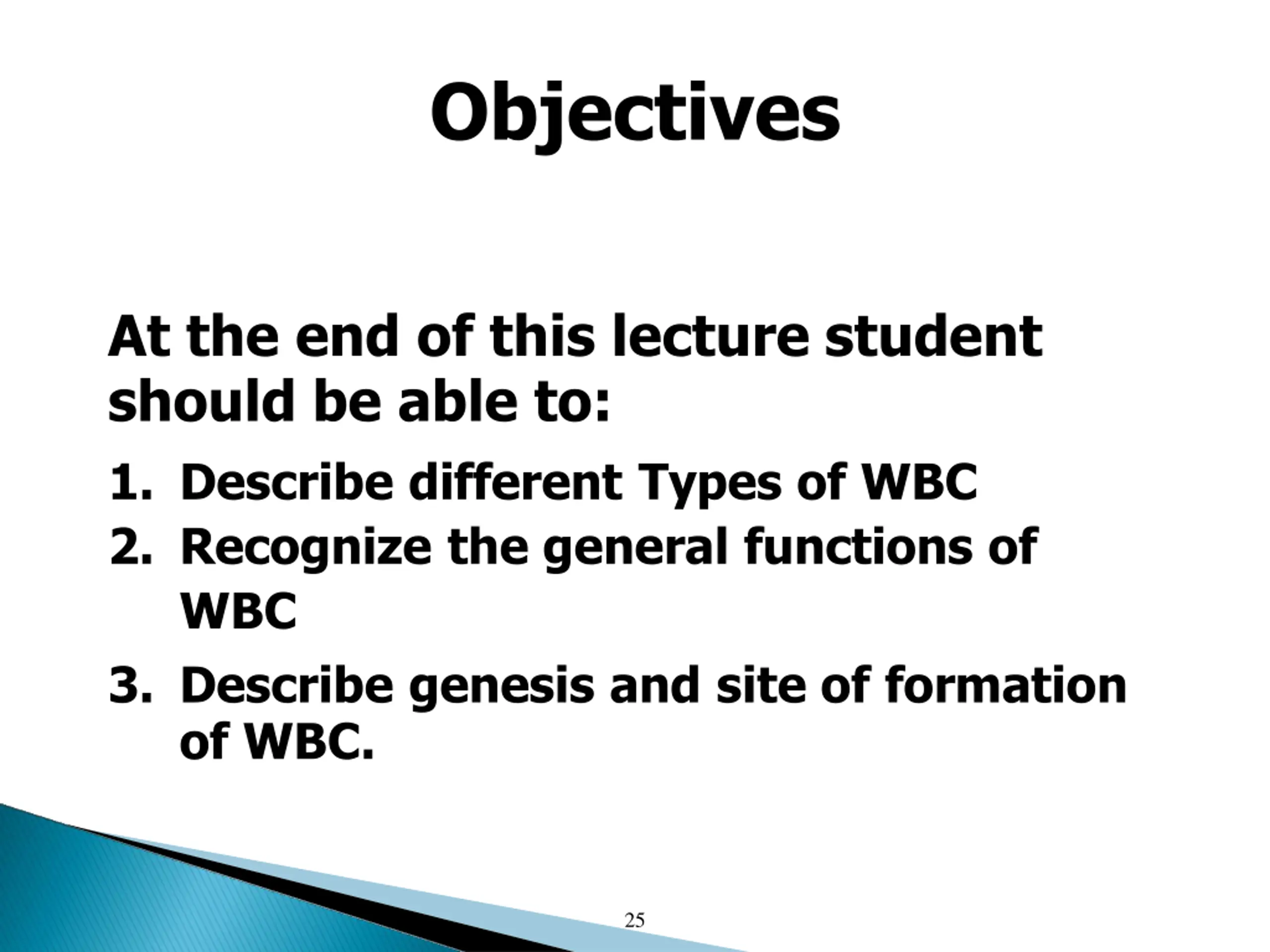 Objectives At the end of this lecture student should be able to: 1. Describe different Types of WBC 2. Recognize the general functions of WBC 3. Describe genesis and site of formation of WBC. 25