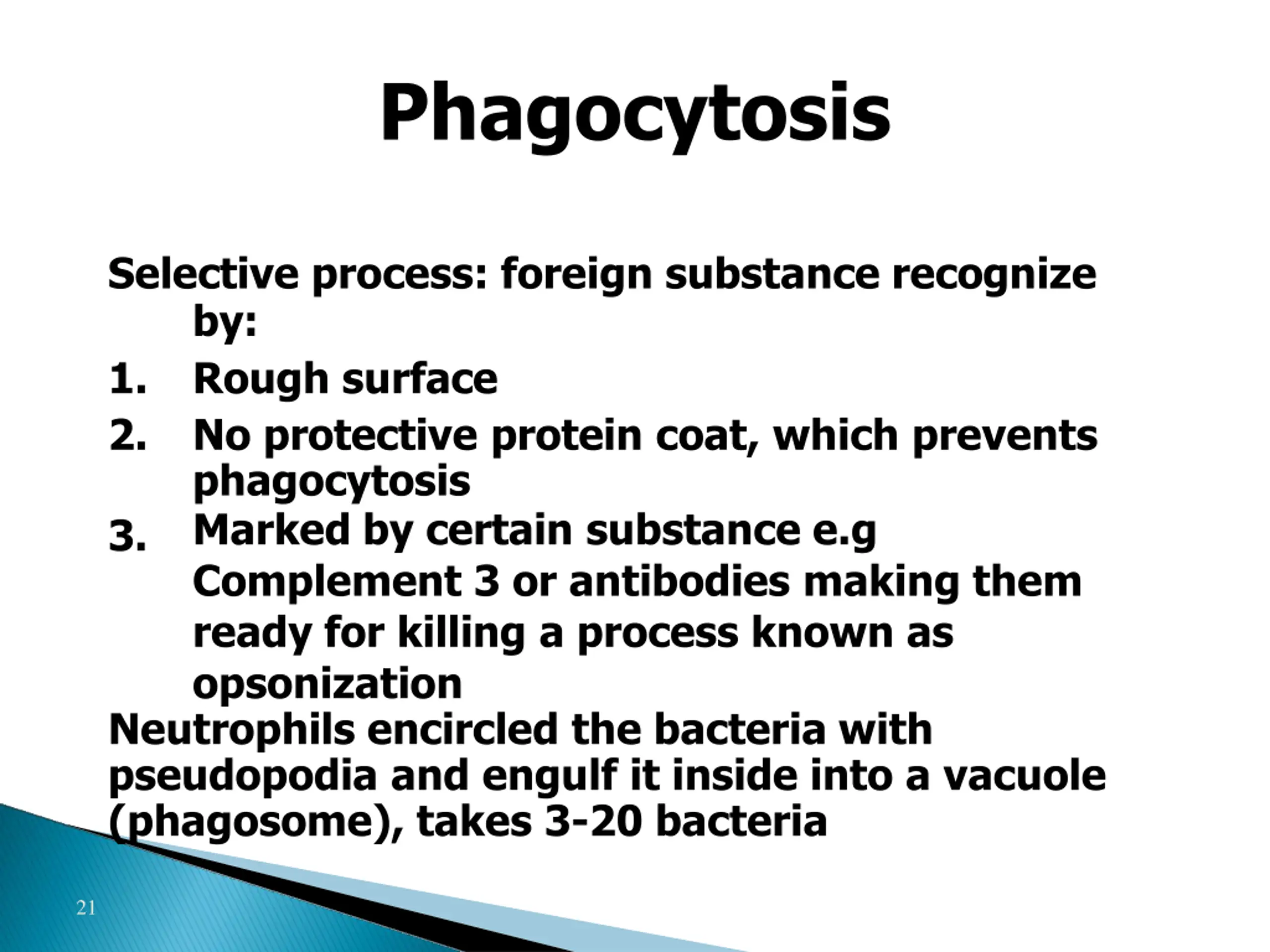 Phagocytosis Selective process: foreign substance recognize by: 1. Rough surface 2. No protective protein coat, which prevents phagocytosis Marked by certain substance e.g Complement 3 or antibodies making them ready for killing a process known as opsonization Neutrophils encircled the bacteria with pseudopodia and engulf it inside into a vacuole (phagosome), takes 3-20 bacteria 3. 21