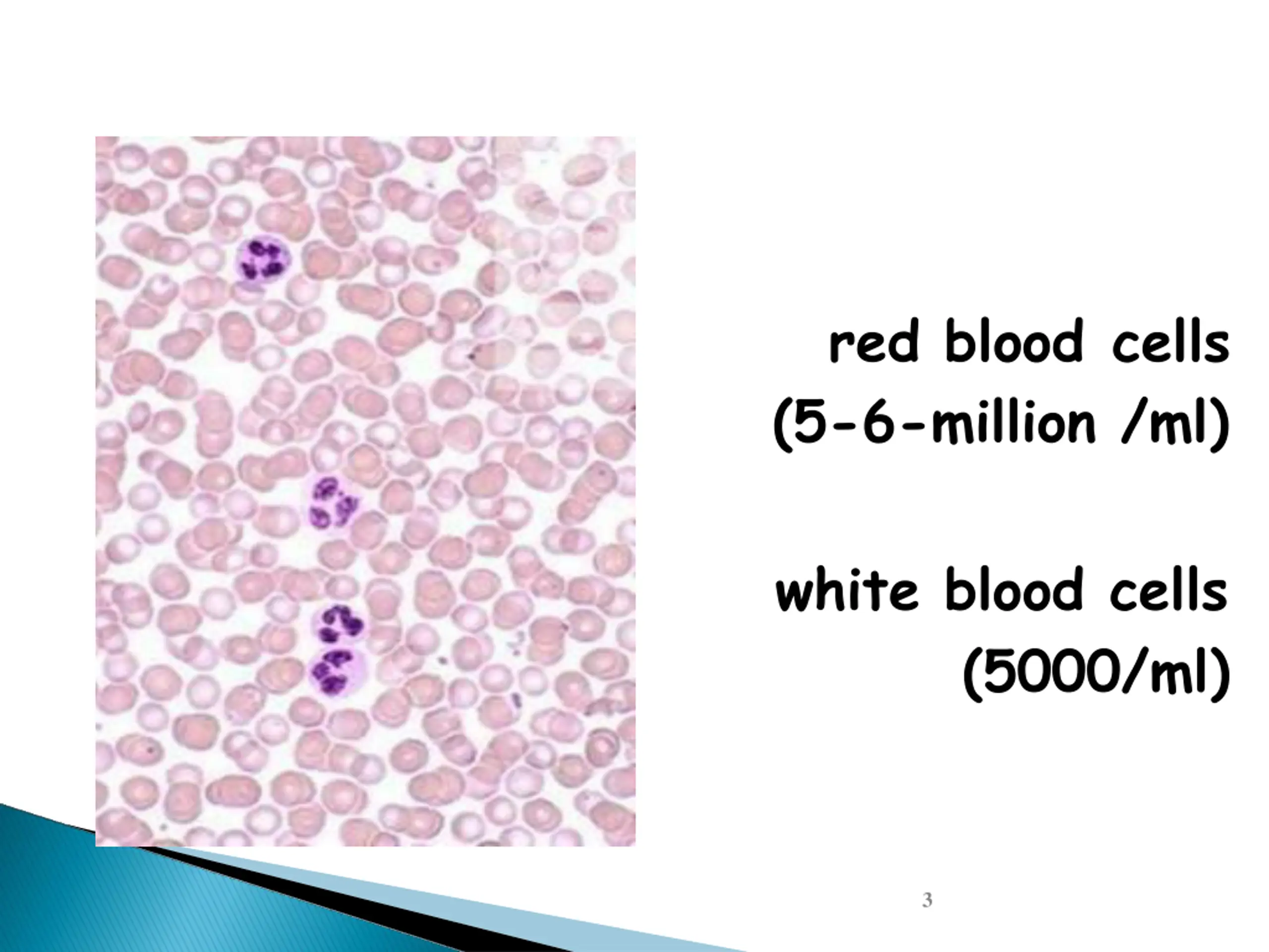 red blood cells (5-6-million /ml) white blood cells (5000/ml) 3