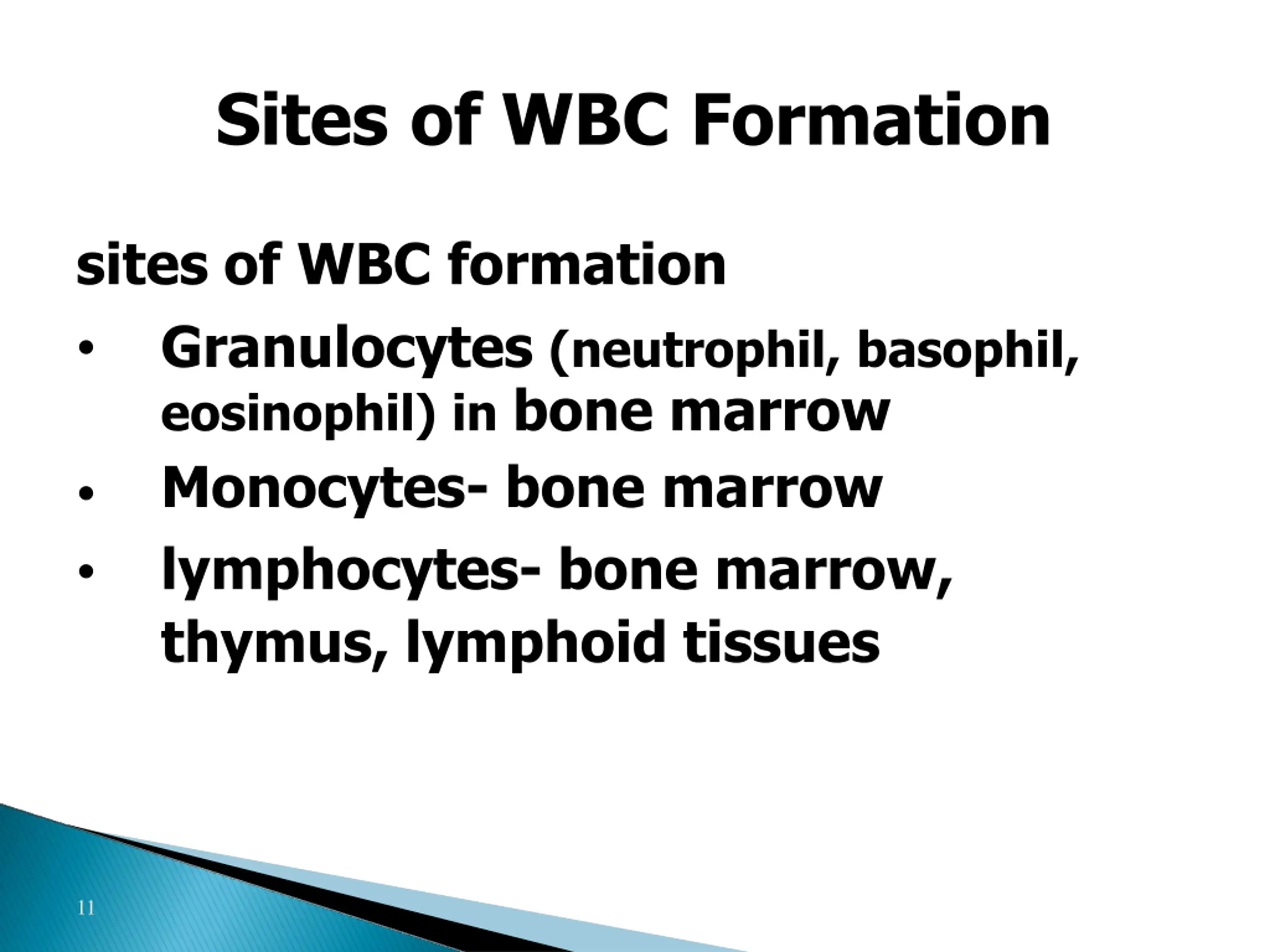 Sites of WBC Formation sites of WBC formation Granulocytes (neutrophil, basophil, eosinophil) in bone marrow Monocytes- bone marrow lymphocytes- bone marrow, thymus, lymphoid tissues 11