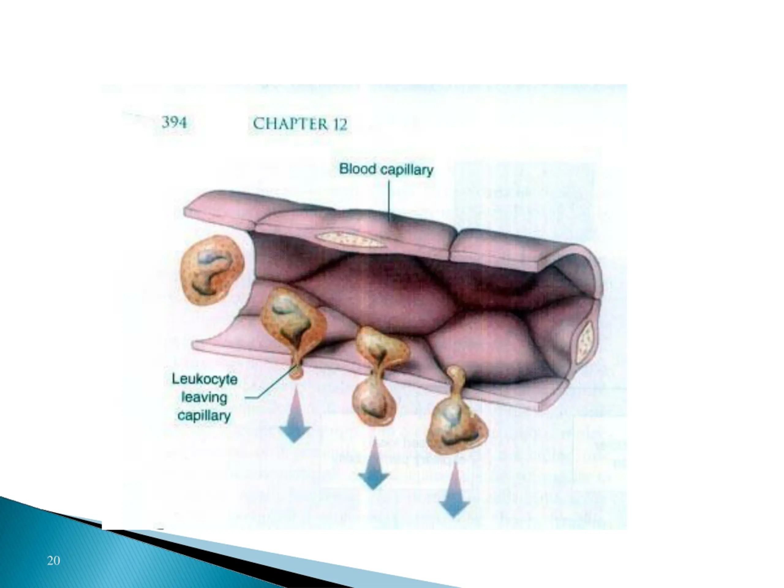 Margination & Diapedesis WBC marginate along the wall of blood capillaries WBC squeezes itself through endothelial holes leaving blood capillaries (diapedesis) WBC move by amoeboid motion towards inflammation area following chemotactic substance released from site of infection Upon reaching the site of infection neutrophils start to engulf infecting organism 19