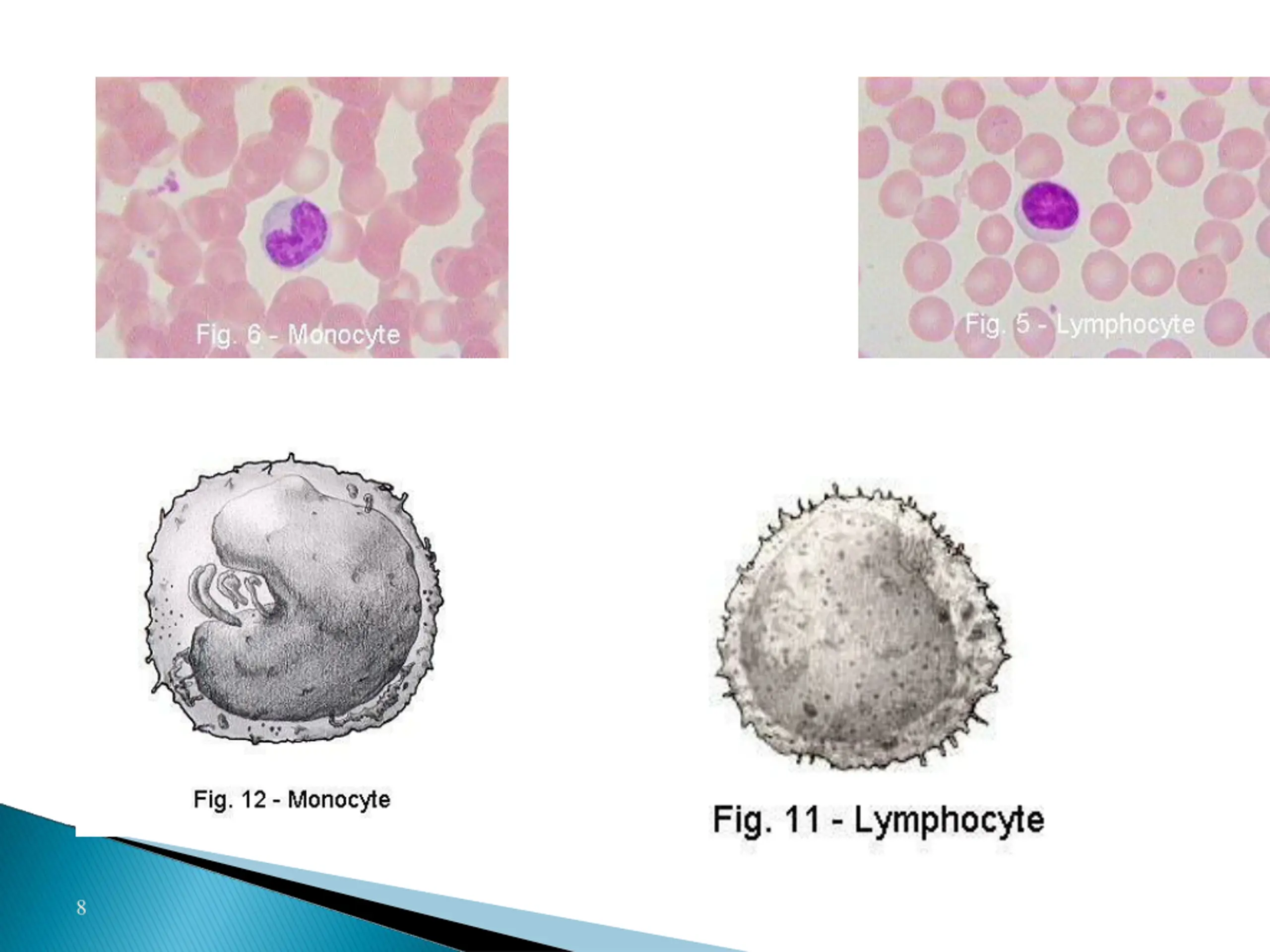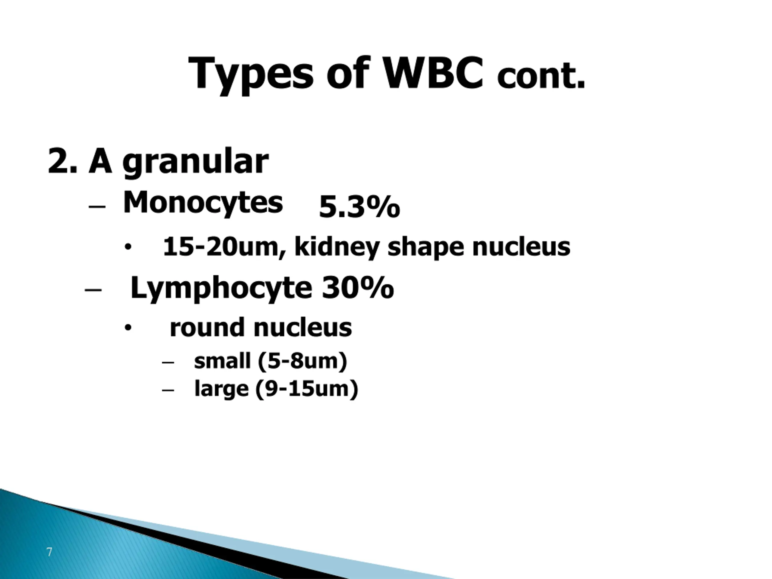 Types of WBC cont. 2. A granular Monocytes 15-20um, kidney shape nucleus Lymphocyte 30% round nucleus small (5-8um) large (9-15um) 5.3% 7
