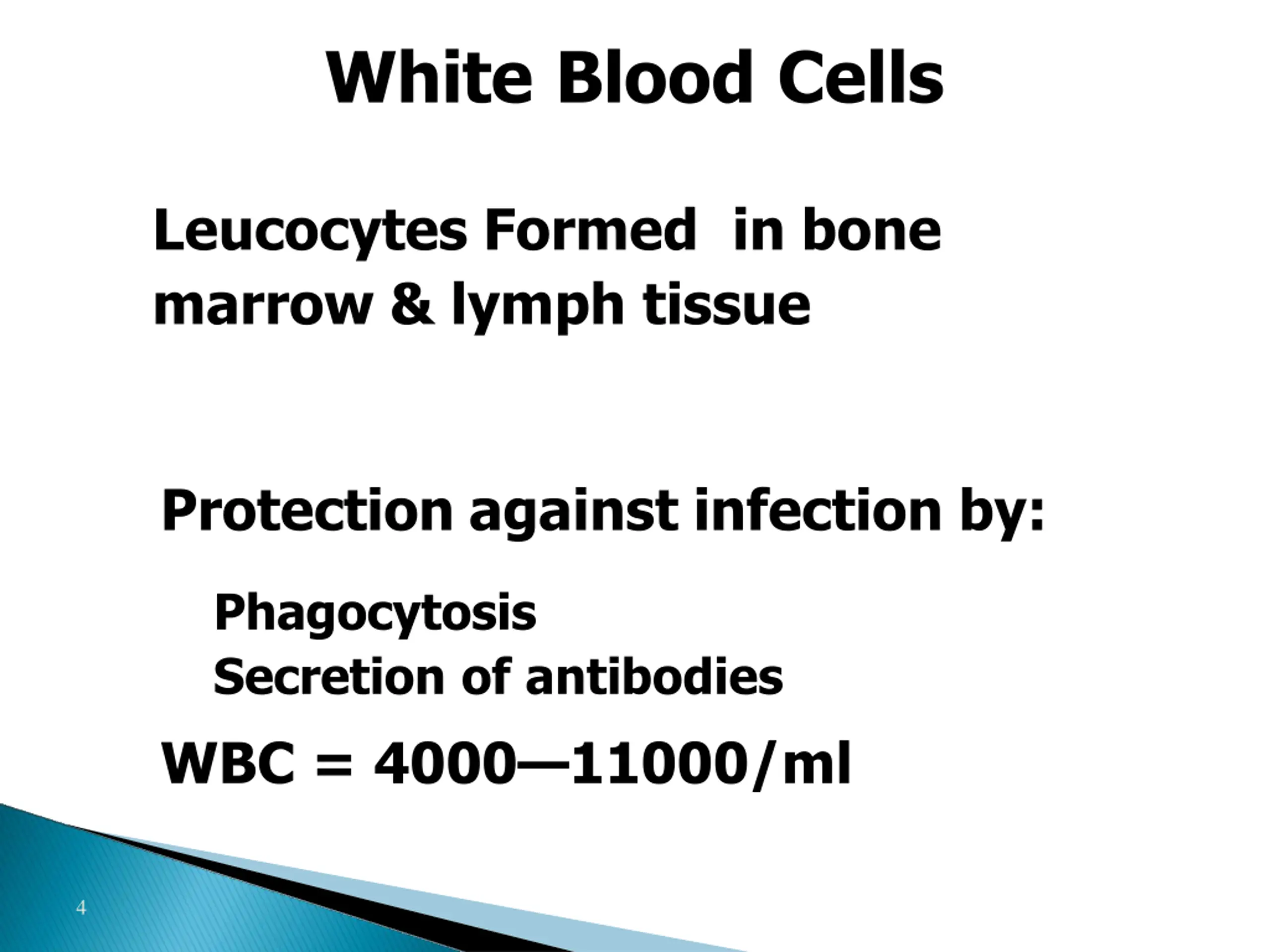White Blood Cells Leucocytes Formed in bone marrow & lymph tissue Protection against infection by: Phagocytosis Secretion of antibodies WBC = 4000 11000/ml 4
