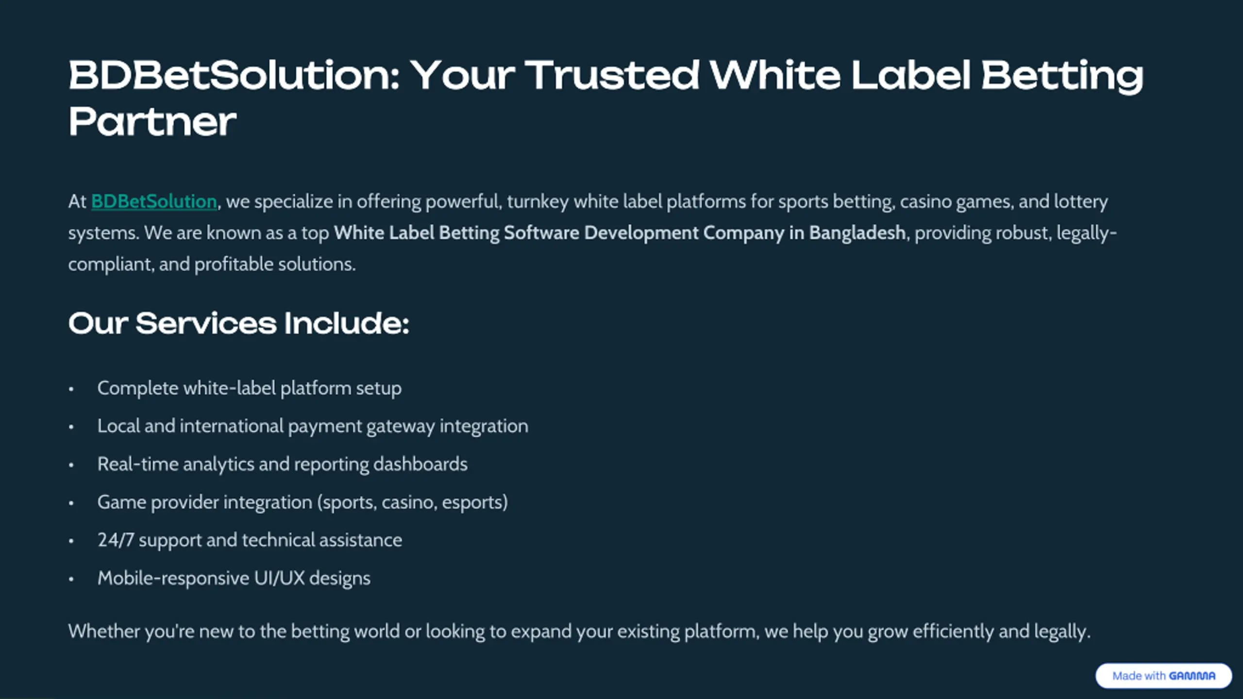 Looking for a trusted White Label Betting Company in Bangladesh? BD Bet Solution offers full-featured, ready-to-launch betting software and website development services. As a leading White Label Betting Software Development Company in Bangladesh, we