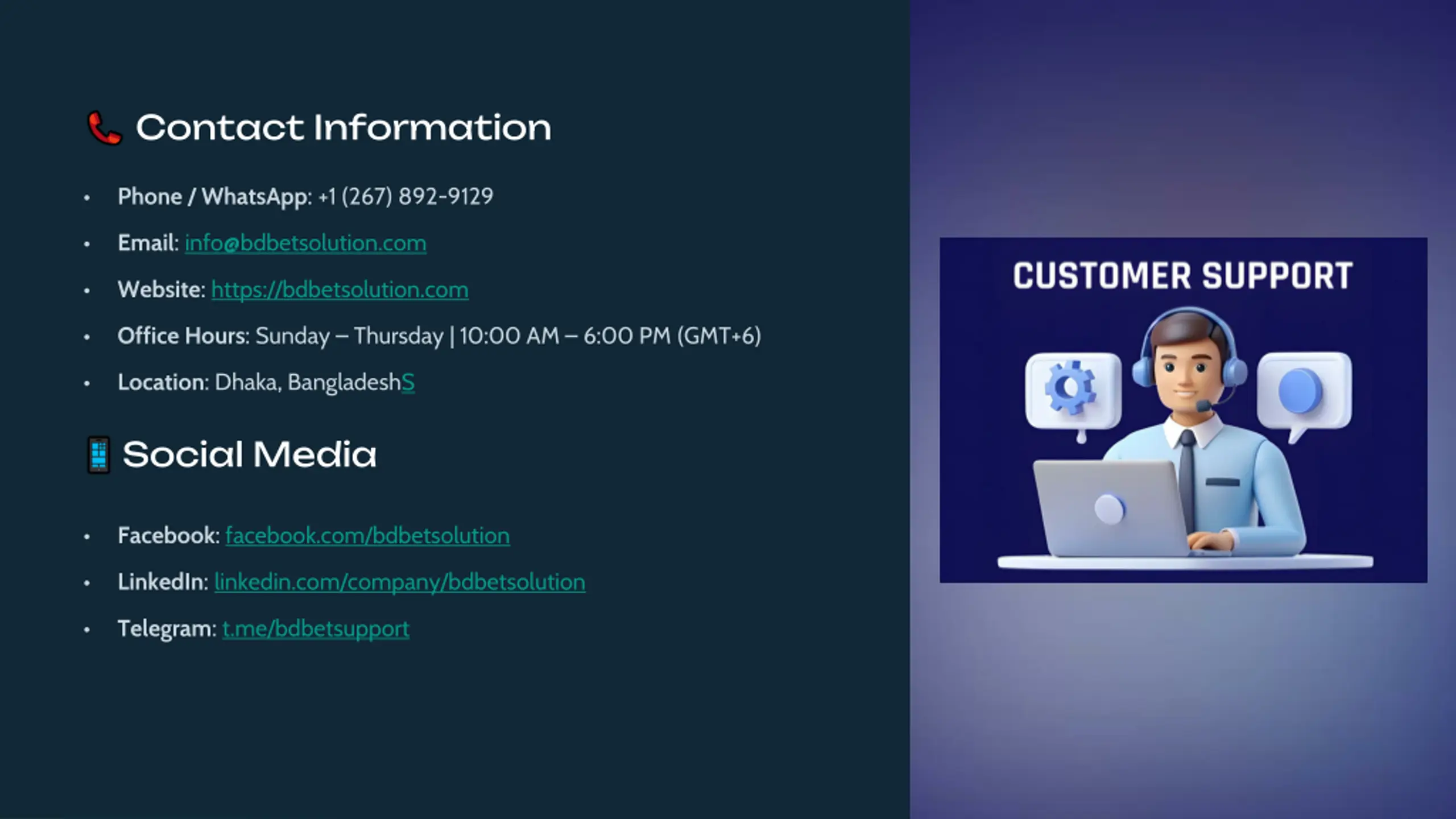 Contact Information Phone / WhatsApp: +1 (267) 892-9129 Email: info@bdbetsolution.com Website: https://bdbetsolution.com Office Hours: Sunday Thursday | 10:00 AM 6:00 PM (GMT+6) Location: Dhaka, BangladeshS Social Media Facebook: facebook.com/bdbetsolution LinkedIn: linkedin.com/company/bdbetsolution Telegram: t.me/bdbetsupport preencoded.png