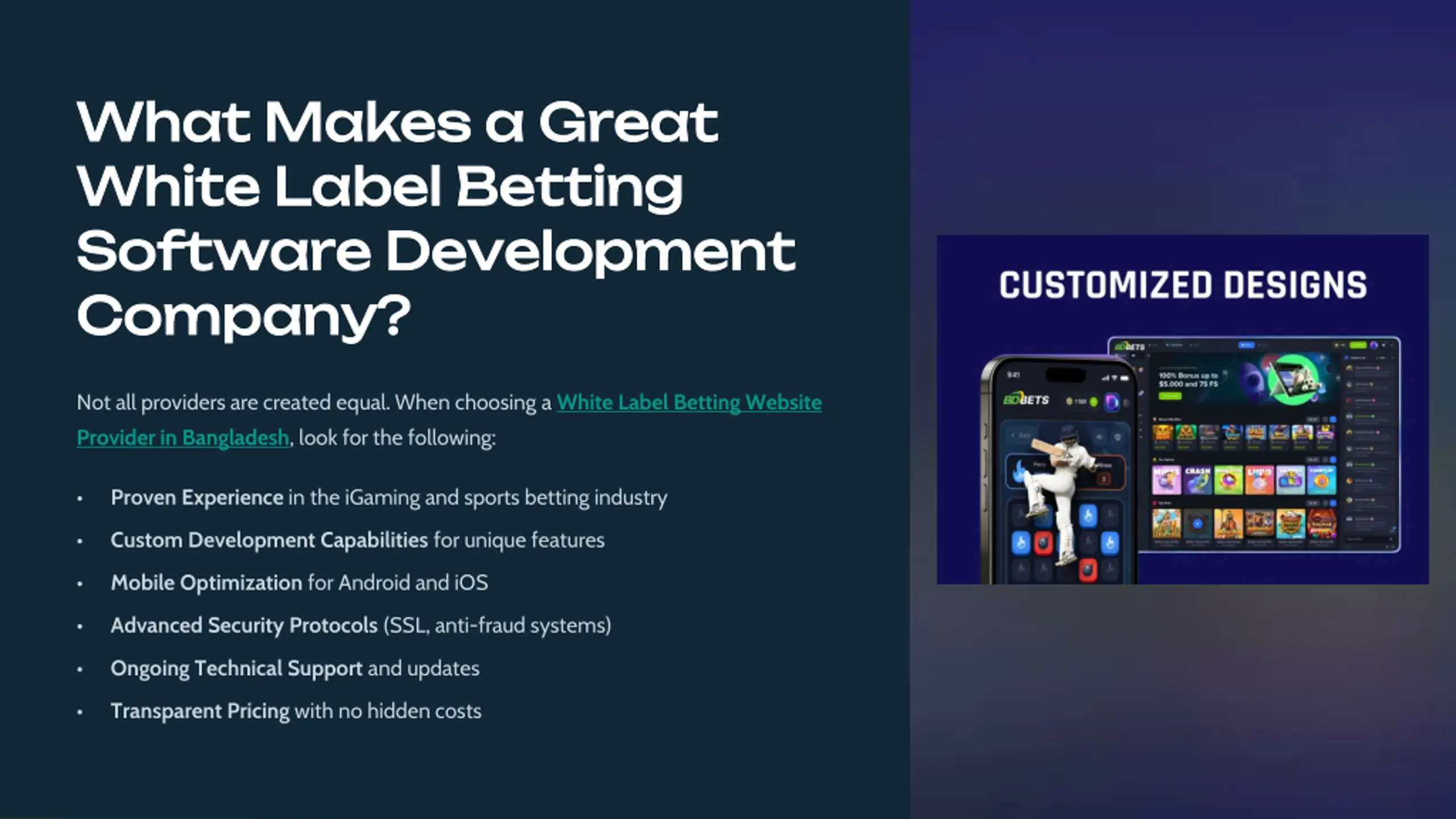 What Makes a Great What Makes a Great White Label Betting White Label Betting Software Development Software Development Company? Company? Not all providers are created equal. When choosing a White Label Betting Website Provider in Bangladesh, look for the following: Proven Experience in the iGaming and sports betting industry Custom Development Capabilities for unique features Mobile Optimization for Android and iOS Advanced Security Protocols (SSL, anti-fraud systems) Ongoing Technical Support and updates Transparent Pricing with no hidden costs preencoded.png