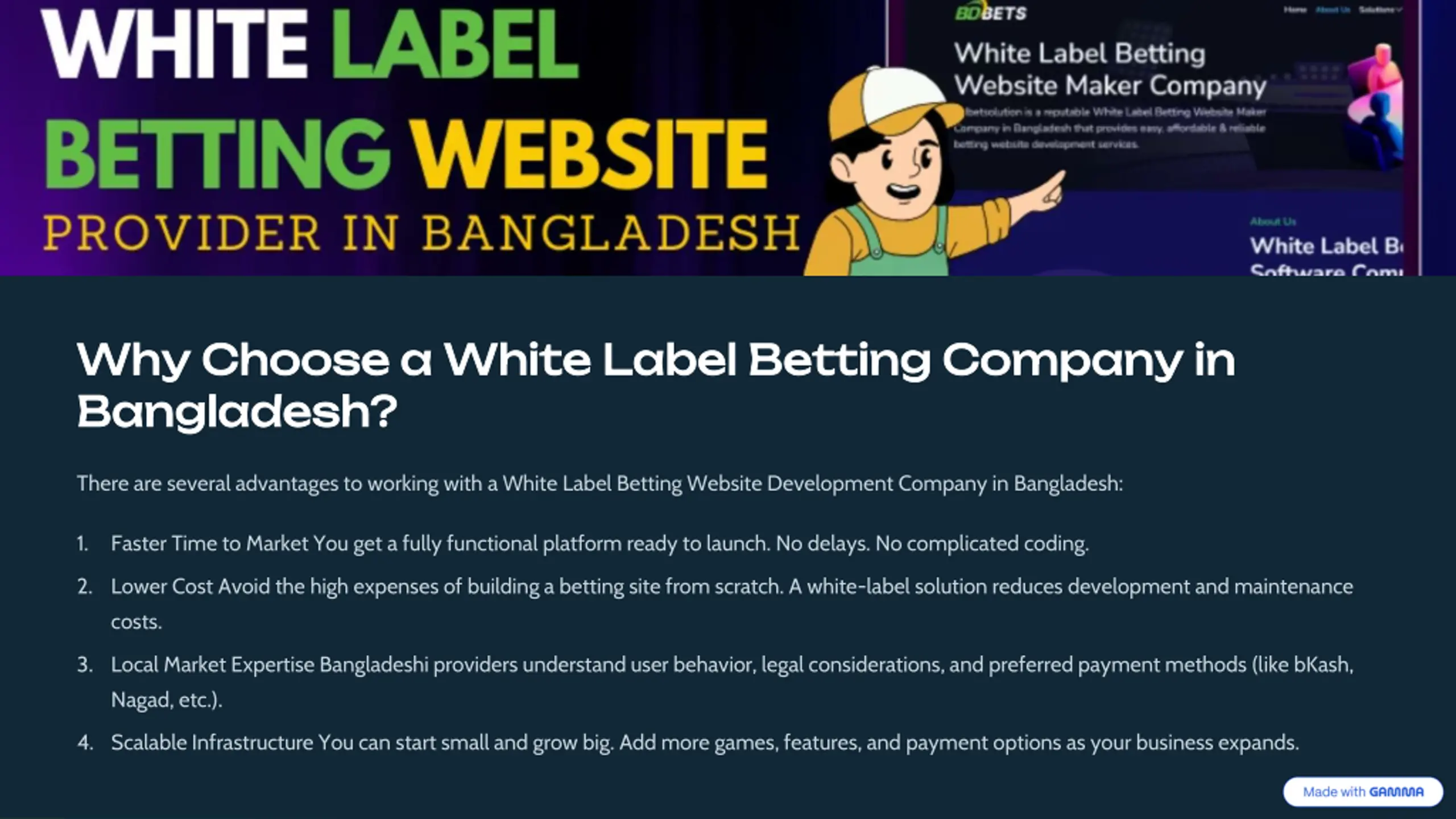 Why Choose a White Label Betting Company in Why Choose a White Label Betting Company in Bangladesh? Bangladesh? There are several advantages to working with a White Label Betting Website Development Company in Bangladesh: 1. Faster Time to Market You get a fully functional platform ready to launch. No delays. No complicated coding. 2. Lower Cost Avoid the high expenses of building a betting site from scratch. A white-label solution reduces development and maintenance costs. 3. Local Market Expertise Bangladeshi providers understand user behavior, legal considerations, and preferred payment methods (like bKash, Nagad, etc.). 4. Scalable Infrastructure You can start small and grow big. Add more games, features, and payment options as your business expands. preencoded.png