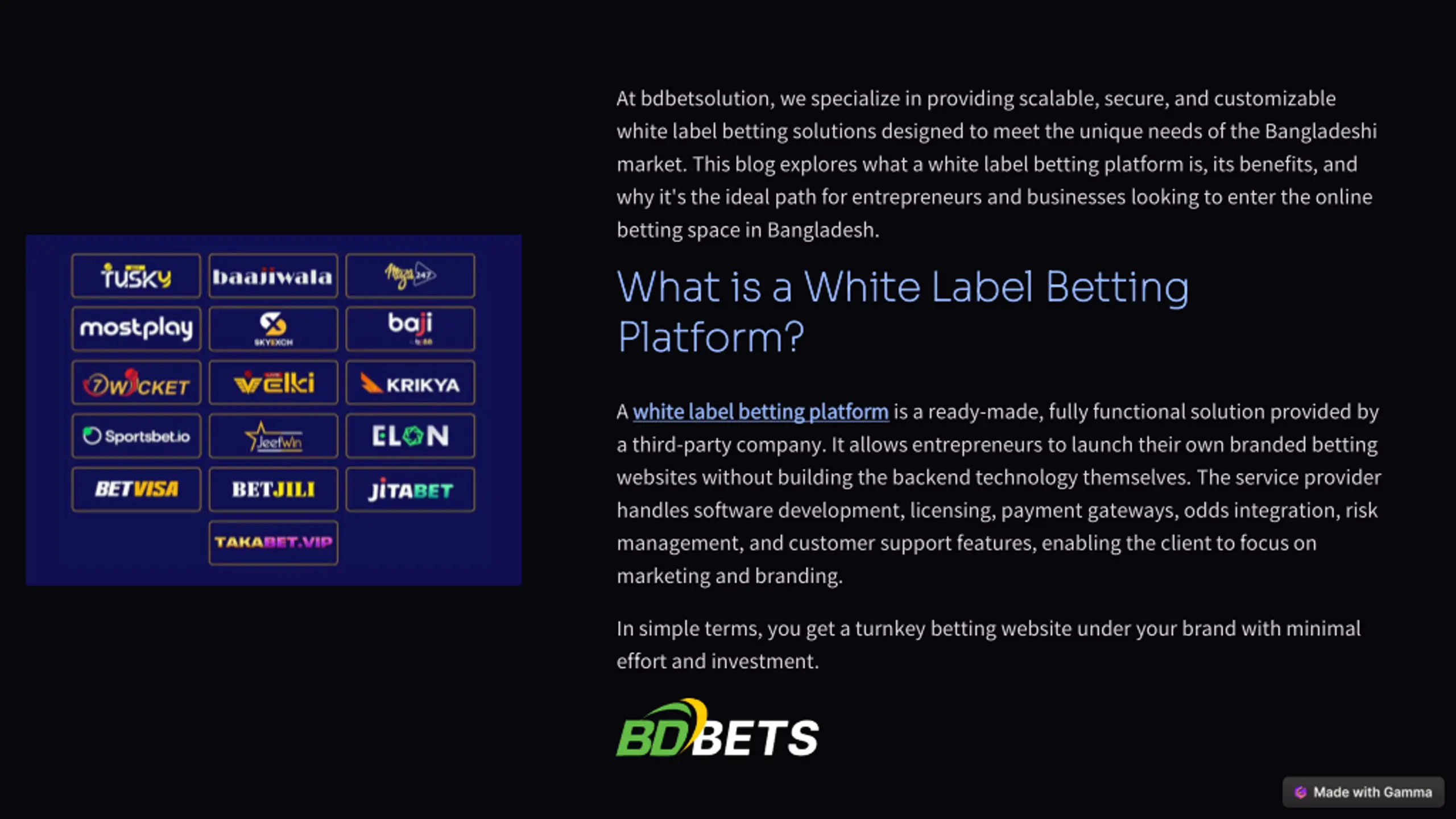 At bdbetsolution, we specialize in providing scalable, secure, and customizable white label betting solutions designed to meet the unique needs of the Bangladeshi market. This blog explores what a white label betting platform is, its benefits, and why it's the ideal path for entrepreneurs and businesses looking to enter the online betting space in Bangladesh. What is a White Label Betting What is a White Label Betting Platform? Platform? A white label betting platform white label betting platform is a ready-made, fully functional solution provided by a third-party company. It allows entrepreneurs to launch their own branded betting websites without building the backend technology themselves. The service provider handles software development, licensing, payment gateways, odds integration, risk management, and customer support features, enabling the client to focus on marketing and branding. In simple terms, you get a turnkey betting website under your brand with minimal effort and investment. preencoded.png
