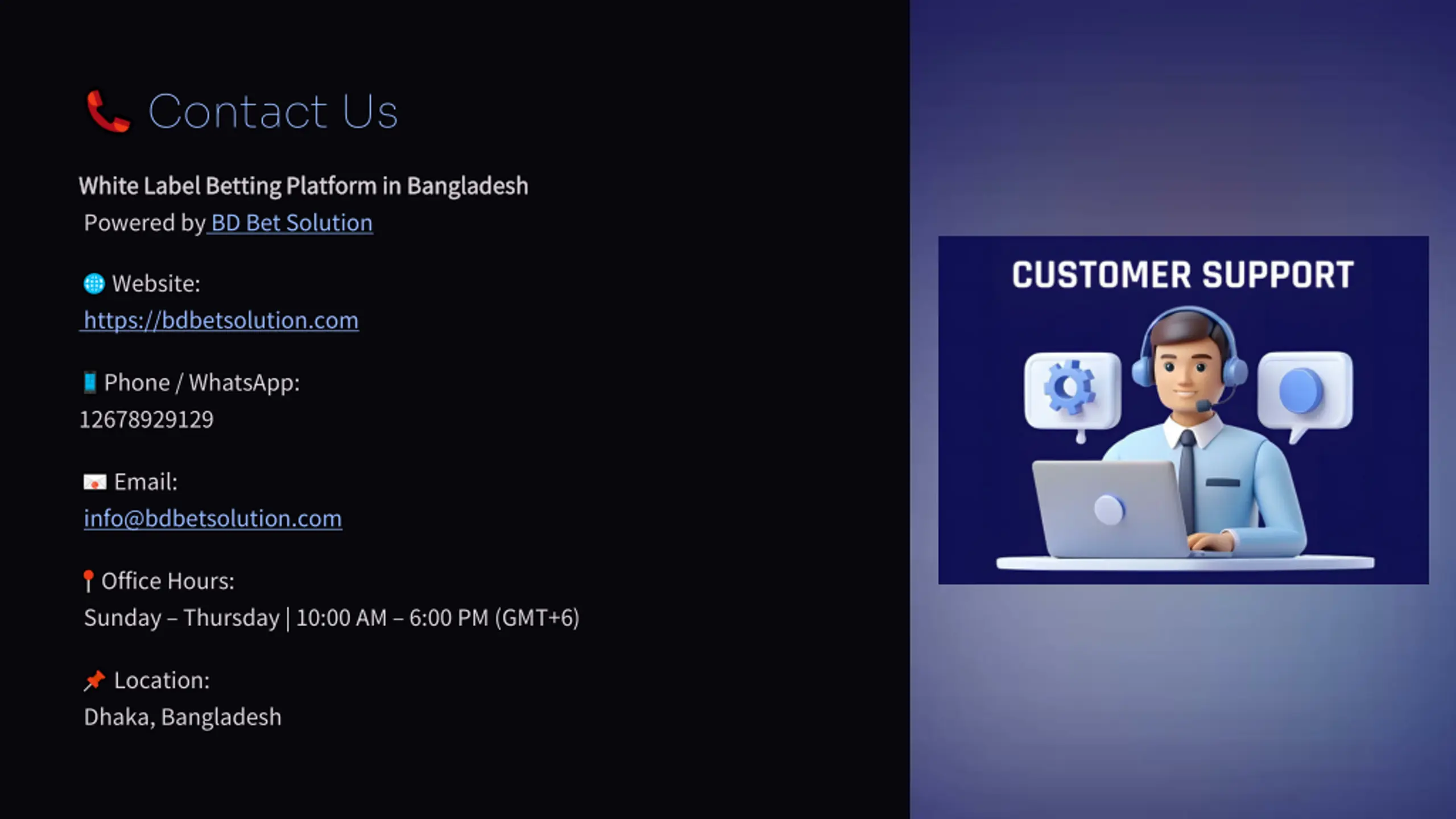 Contact Us White Label Betting Platform in Bangladesh White Label Betting Platform in Bangladesh Powered by BD Bet Solution Website: https://bdbetsolution.com Phone / WhatsApp: 12678929129 Email: info@bdbetsolution.com Office Hours: Sunday Thursday | 10:00 AM 6:00 PM (GMT+6) Location: Dhaka, Bangladesh preencoded.png
