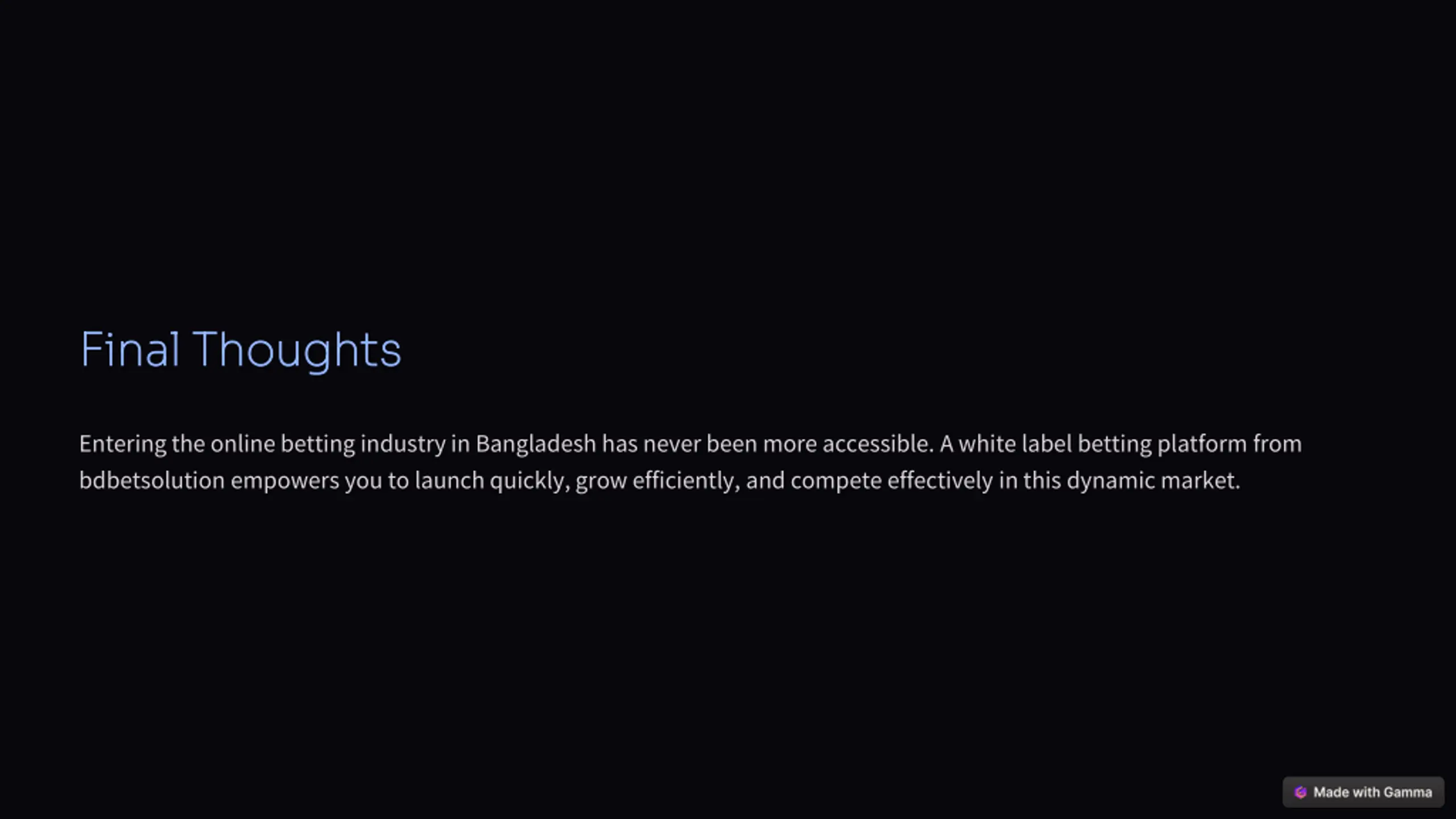 Final Thoughts Final Thoughts Entering the online betting industry in Bangladesh has never been more accessible. A white label betting platform from bdbetsolution empowers you to launch quickly, grow efficiently, and compete effectively in this dynamic market. preencoded.png