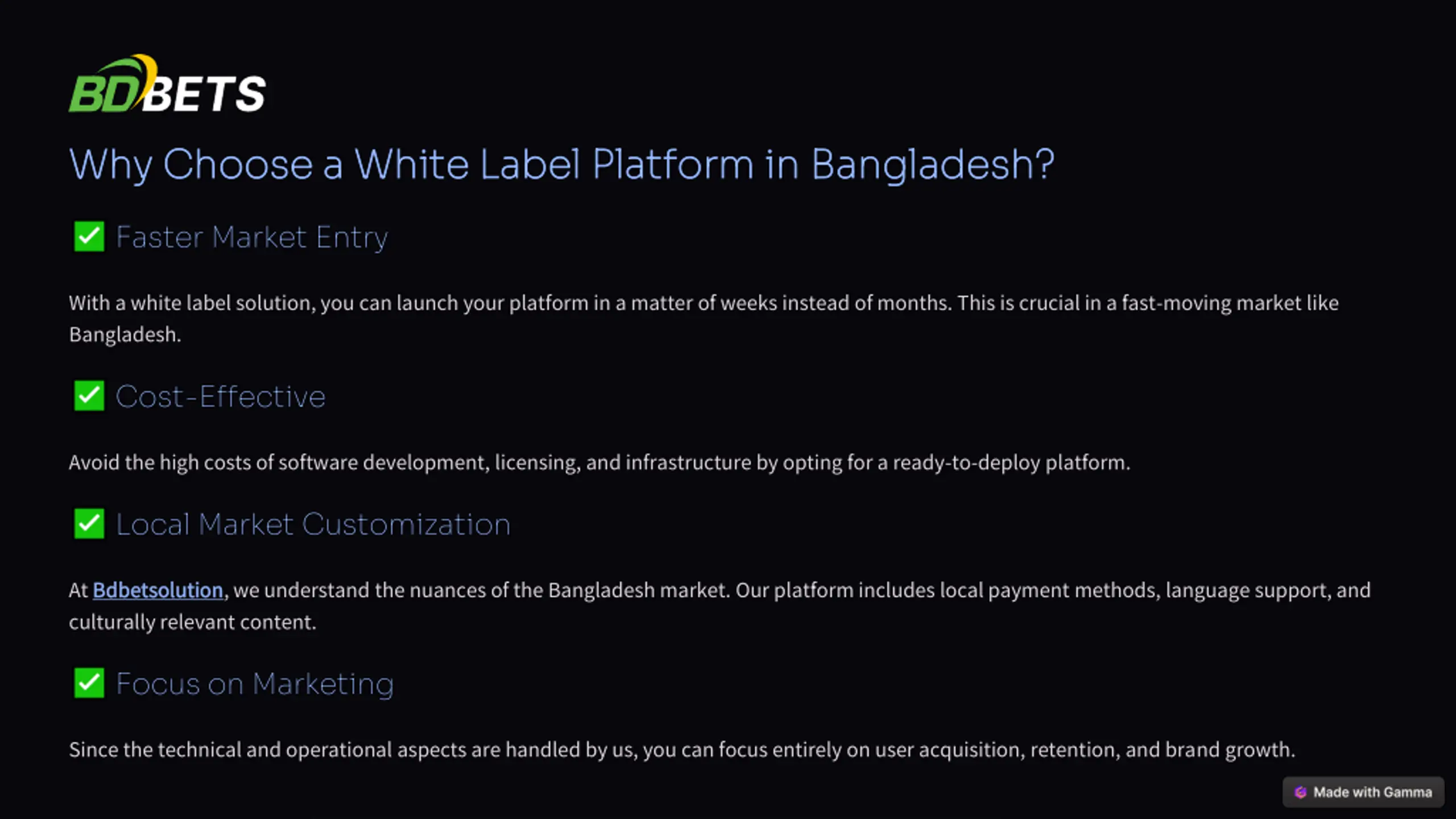 Why Choose a White Label Platform in Bangladesh? Why Choose a White Label Platform in Bangladesh? Faster Market Entry With a white label solution, you can launch your platform in a matter of weeks instead of months. This is crucial in a fast-moving market like Bangladesh. Cost-Effective Avoid the high costs of software development, licensing, and infrastructure by opting for a ready-to-deploy platform. Local Market Customization At Bdbetsolution Bdbetsolution, we understand the nuances of the Bangladesh market. Our platform includes local payment methods, language support, and culturally relevant content. Focus on Marketing Since the technical and operational aspects are handled by us, you can focus entirely on user acquisition, retention, and brand growth. preencoded.png