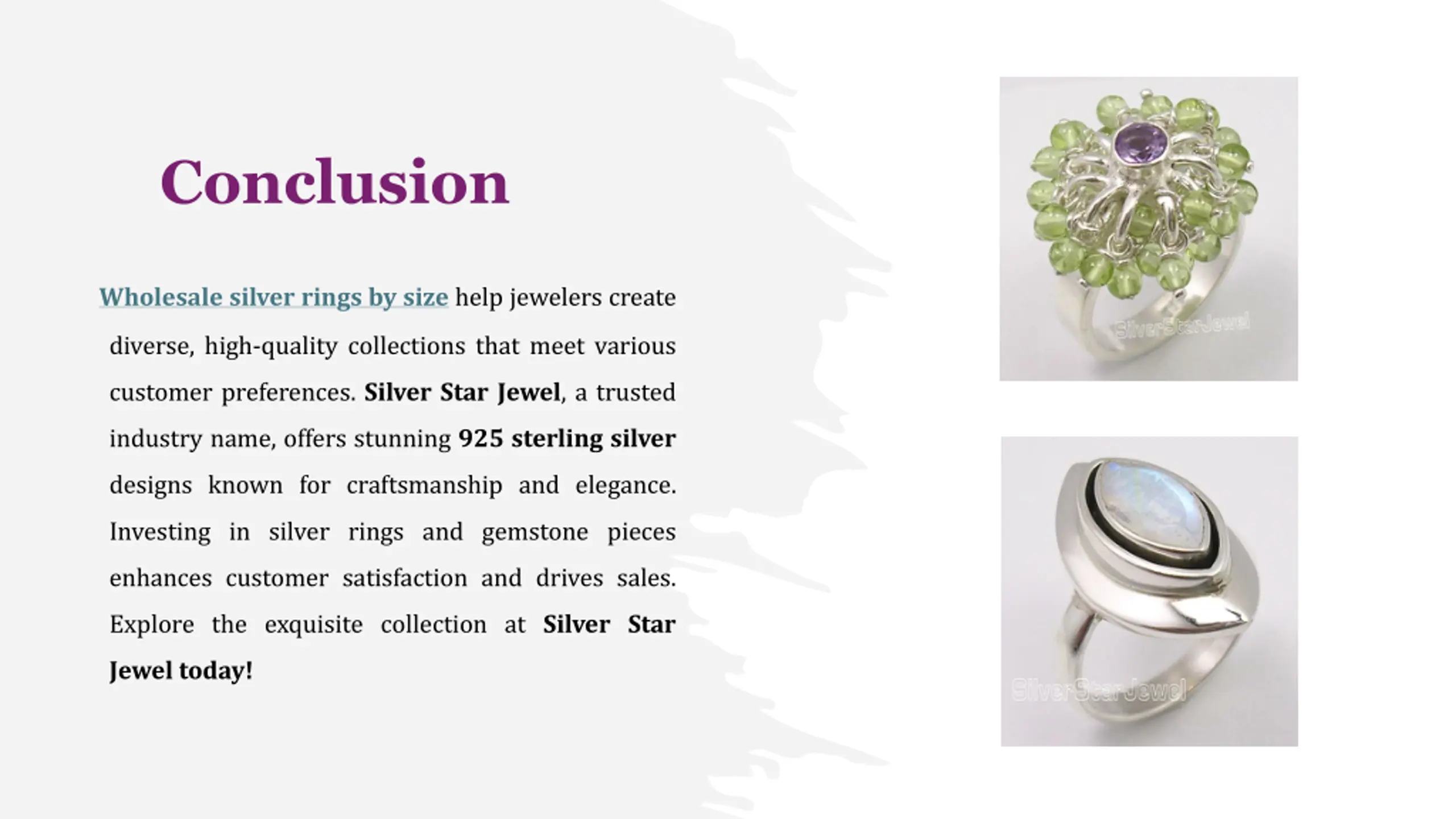 Conclusion Wholesale silver rings by size help jewelers create diverse, high-quality collections that meet various customer preferences. Silver Star Jewel, a trusted industry name, offers stunning 925 sterling silver designs known for craftsmanship and elegance. Investing in silver rings and gemstone pieces enhances customer satisfaction and drives sales. Explore the exquisite collection at Silver Star Jewel today!