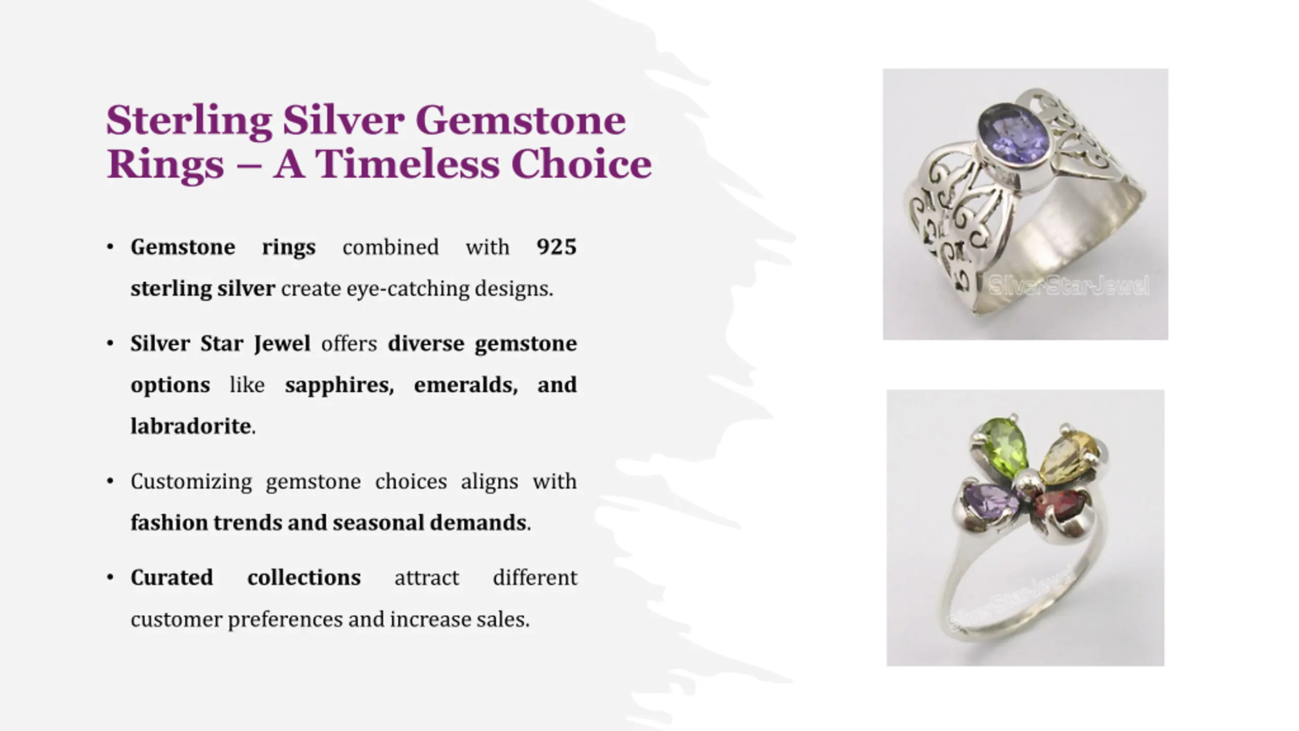 Sterling Silver Gemstone Rings A Timeless Choice Gemstone rings combined with 925 sterling silver create eye-catching designs. Silver Star Jewel offers diverse gemstone options like sapphires, emeralds, and labradorite. Customizing gemstone choices aligns with fashion trends and seasonal demands. Curated collections attract different customer preferences andincrease sales.