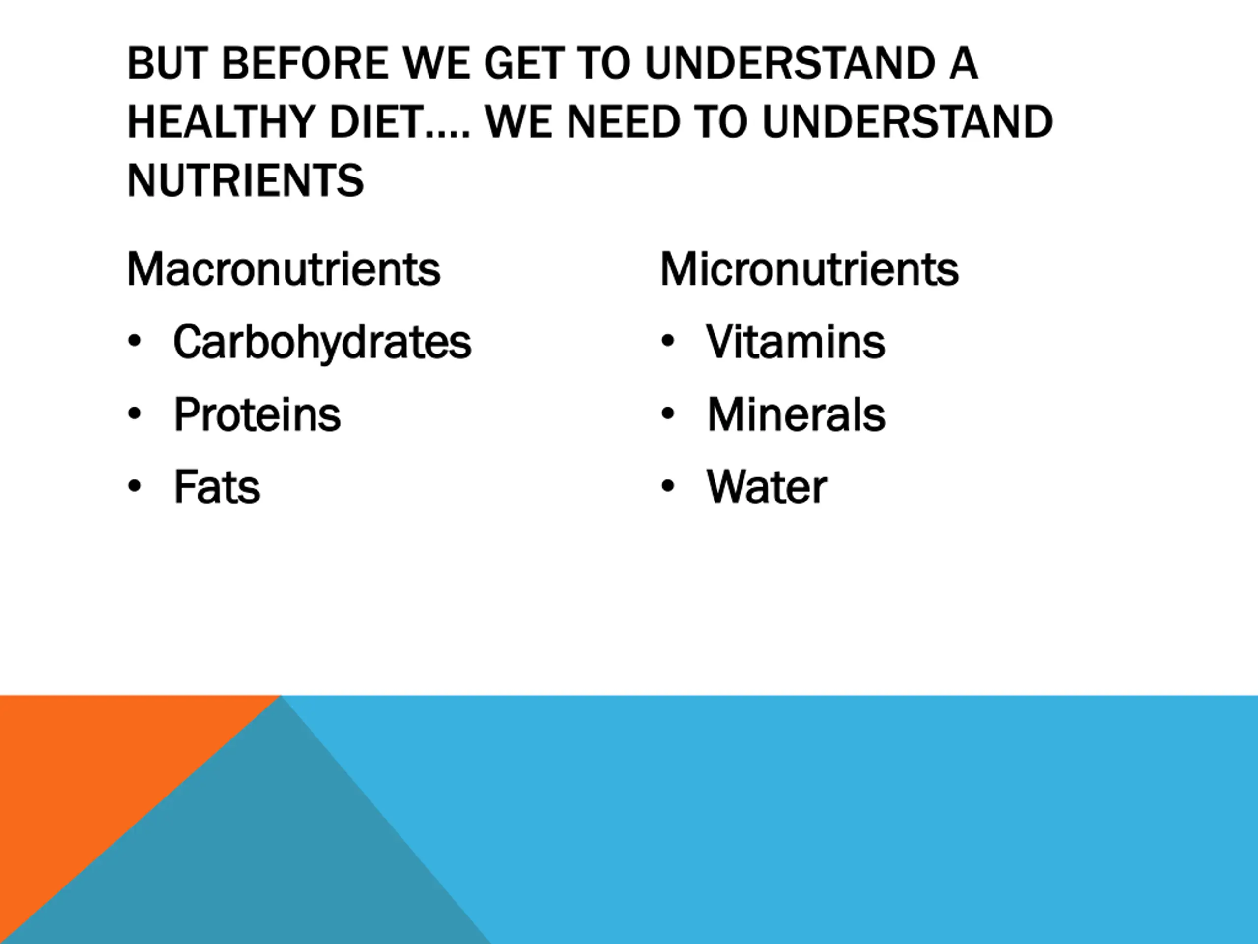 BUT BEFORE WE GET TO UNDERSTAND A HEALTHY DIET . WE NEED TO UNDERSTAND NUTRIENTS Macronutrients Macronutrients Carbohydrates Carbohydrates Proteins Proteins Fats Fats Micronutrients Micronutrients Vitamins Vitamins Minerals Minerals Water Water