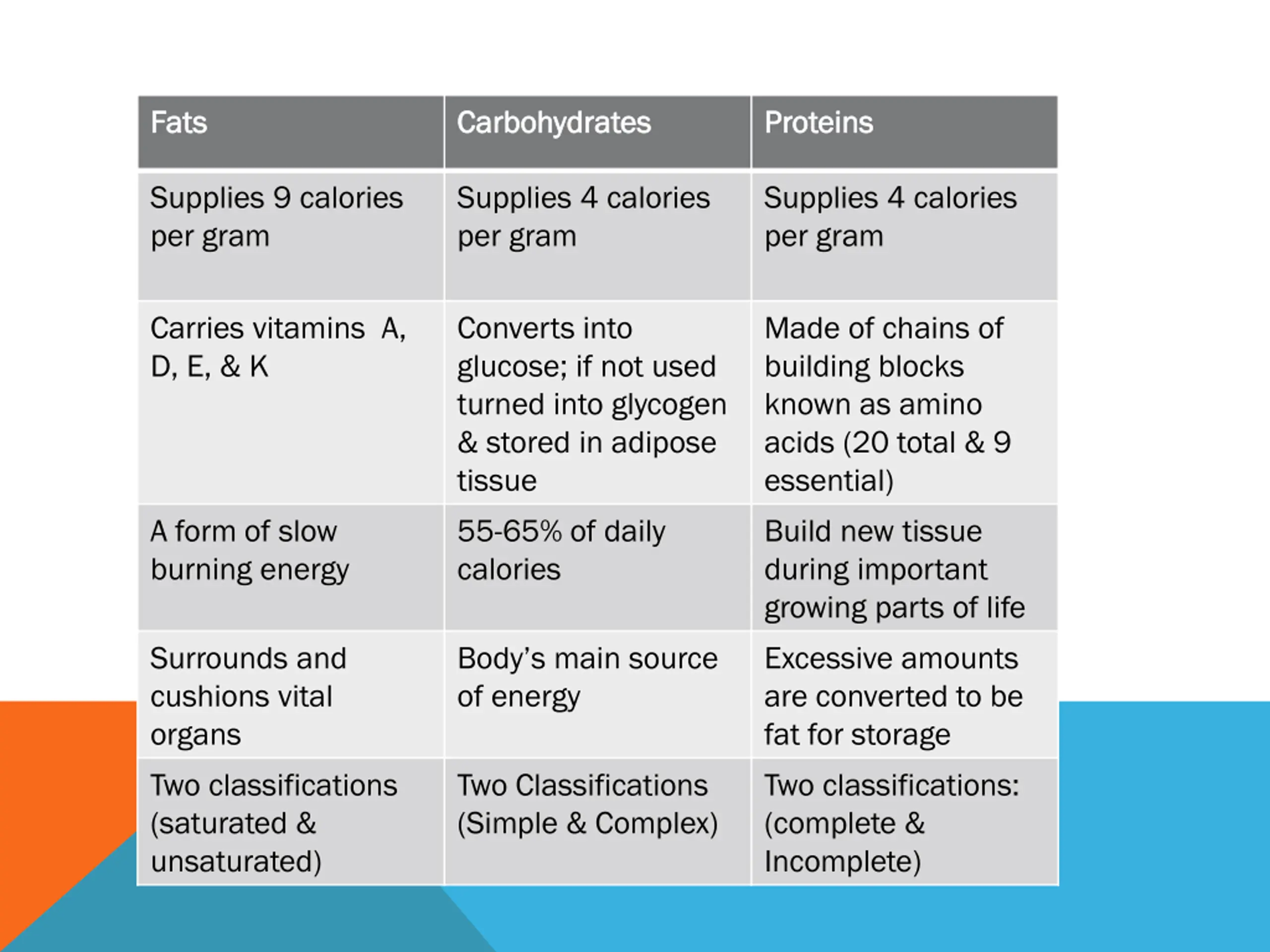 Fats Fats Carbohydrates Carbohydrates Proteins Proteins Supplies 9 calories per gram Supplies 4 calories per gram Supplies 4 calories per gram Carries vitamins A, D, E, & K Converts into glucose; if not used turned into glycogen & stored in adipose tissue 55-65% of daily calories Made of chains of building blocks known as amino acids (20 total & 9 essential) Build new tissue during important growing parts of life Excessive amounts are converted to be fat for storage Two classifications: (complete & Incomplete) A form of slow burning energy Surrounds and cushions vital organs Two classifications (saturated & unsaturated) Body s main source of energy Two Classifications (Simple & Complex)