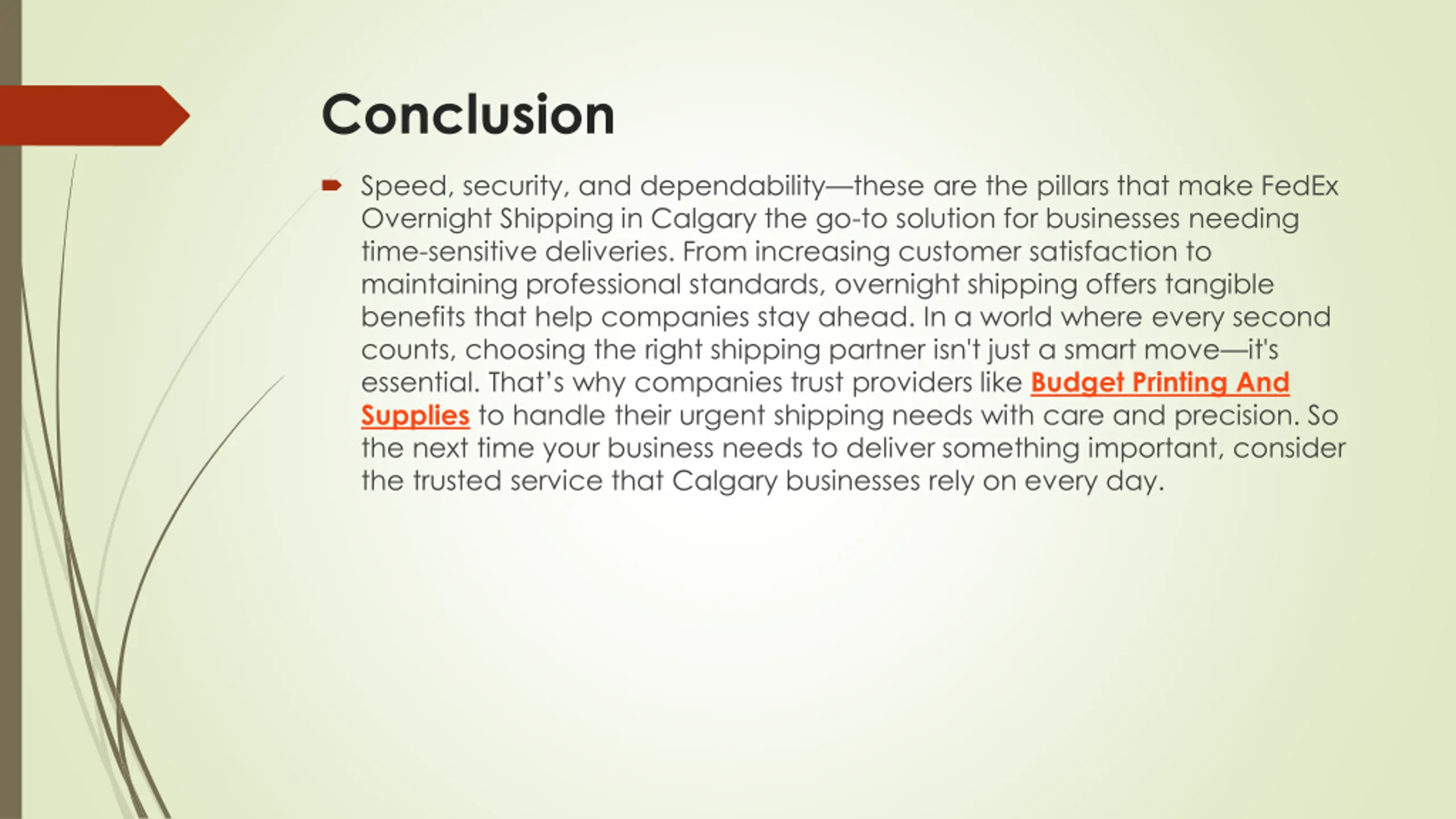 Conclusion Speed, security, and dependability these are the pillars that make FedEx Overnight Shipping in Calgary the go-to solution for businesses needing time-sensitive deliveries. From increasing customer satisfaction to maintaining professional standards, overnight shipping offers tangible benefits that help companies stay ahead. In a world where every second counts, choosing the right shipping partner isn't just a smart move it's essential. That s why companies trust providers like Budget Printing And Supplies to handle their urgent shipping needs with care and precision. So the next time your business needs to deliver something important, consider the trusted service that Calgary businesses rely on every day.