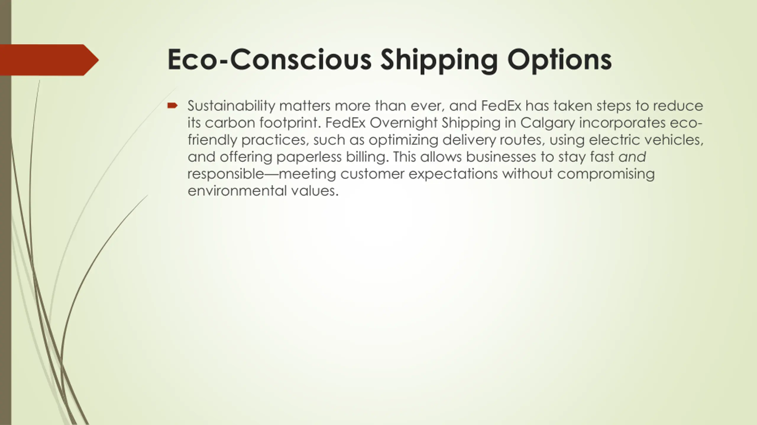 Eco-Conscious Shipping Options Sustainability matters more than ever, and FedEx has taken steps to reduce its carbon footprint. FedEx Overnight Shipping in Calgary incorporates eco- friendly practices, such as optimizing delivery routes, using electric vehicles, and offering paperless billing. This allows businesses to stay fast and responsible meeting customer expectations without compromising environmental values.