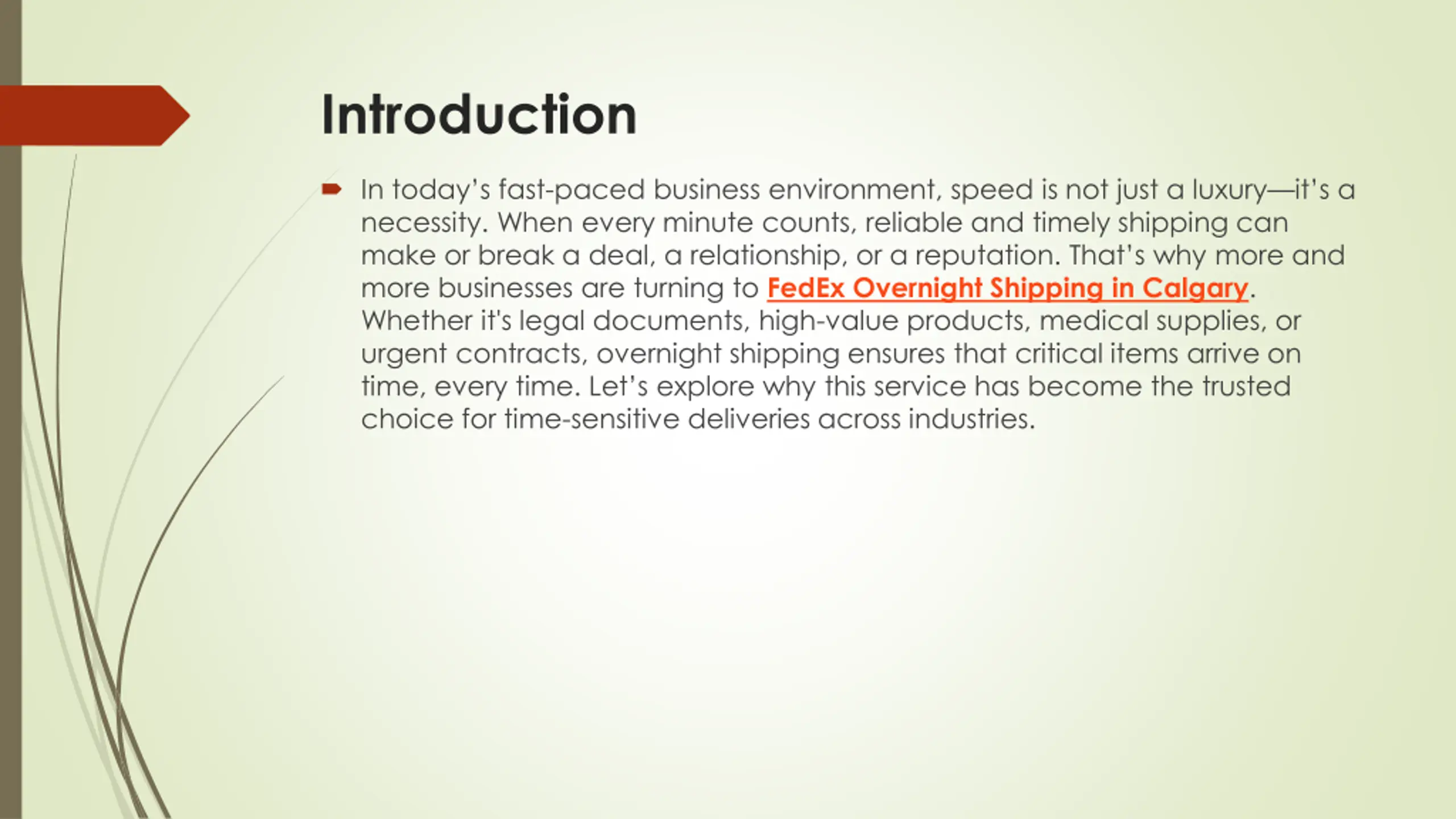 Introduction In today s fast-paced business environment, speed is not just a luxury it s a necessity. When every minute counts, reliable and timely shipping can make or break a deal, a relationship, or a reputation. That s why more and more businesses are turning to FedEx Overnight Shipping in Calgary. Whether it's legal documents, high-value products, medical supplies, or urgent contracts, overnight shipping ensures that critical items arrive on time, every time. Let s explore why this service has become the trusted choice for time-sensitive deliveries across industries.