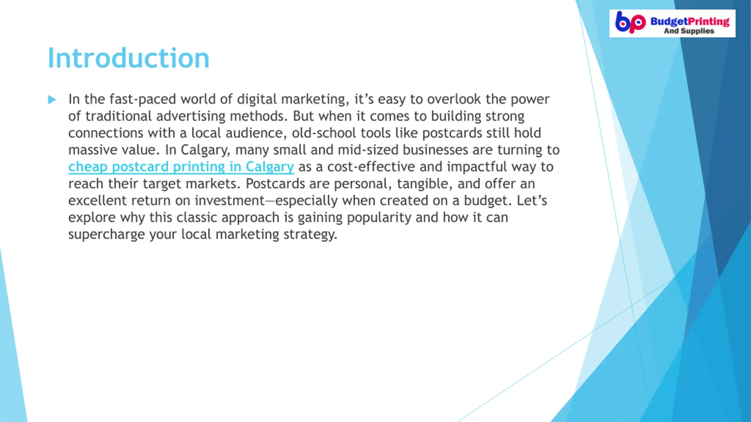 Introduction In the fast-paced world of digital marketing, it s easy to overlook the power of traditional advertising methods. But when it comes to building strong connections with a local audience, old-school tools like postcards still hold massive value. In Calgary, many small and mid-sized businesses are turning to cheap postcard printing in Calgary as a cost-effective and impactful way to reach their target markets. Postcards are personal, tangible, and offer an excellent return on investment especially when created on a budget. Let s explore why this classic approach is gaining popularity and how it can supercharge your local marketing strategy.