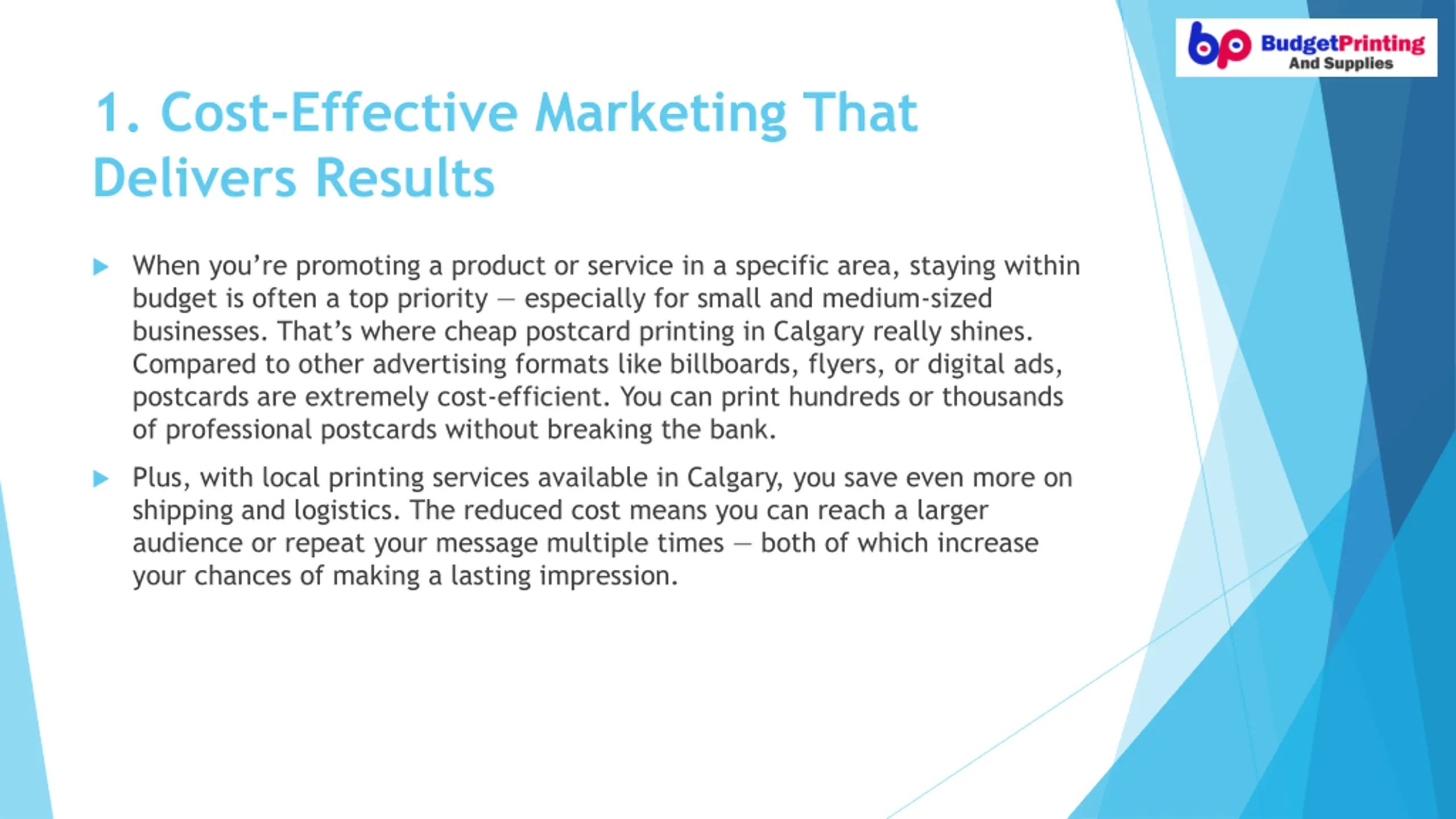 1. Cost-Effective Marketing That Delivers Results When you re promoting a product or service in a specific area, staying within budget is often a top priority especially for small and medium-sized businesses. That s where cheap postcard printing in Calgary really shines. Compared to other advertising formats like billboards, flyers, or digital ads, postcards are extremely cost-efficient. You can print hundreds or thousands of professional postcards without breaking the bank. Plus, with local printing services available in Calgary, you save even more on shipping and logistics. The reduced cost means you can reach a larger audience or repeat your message multiple times both of which increase your chances of making a lasting impression.