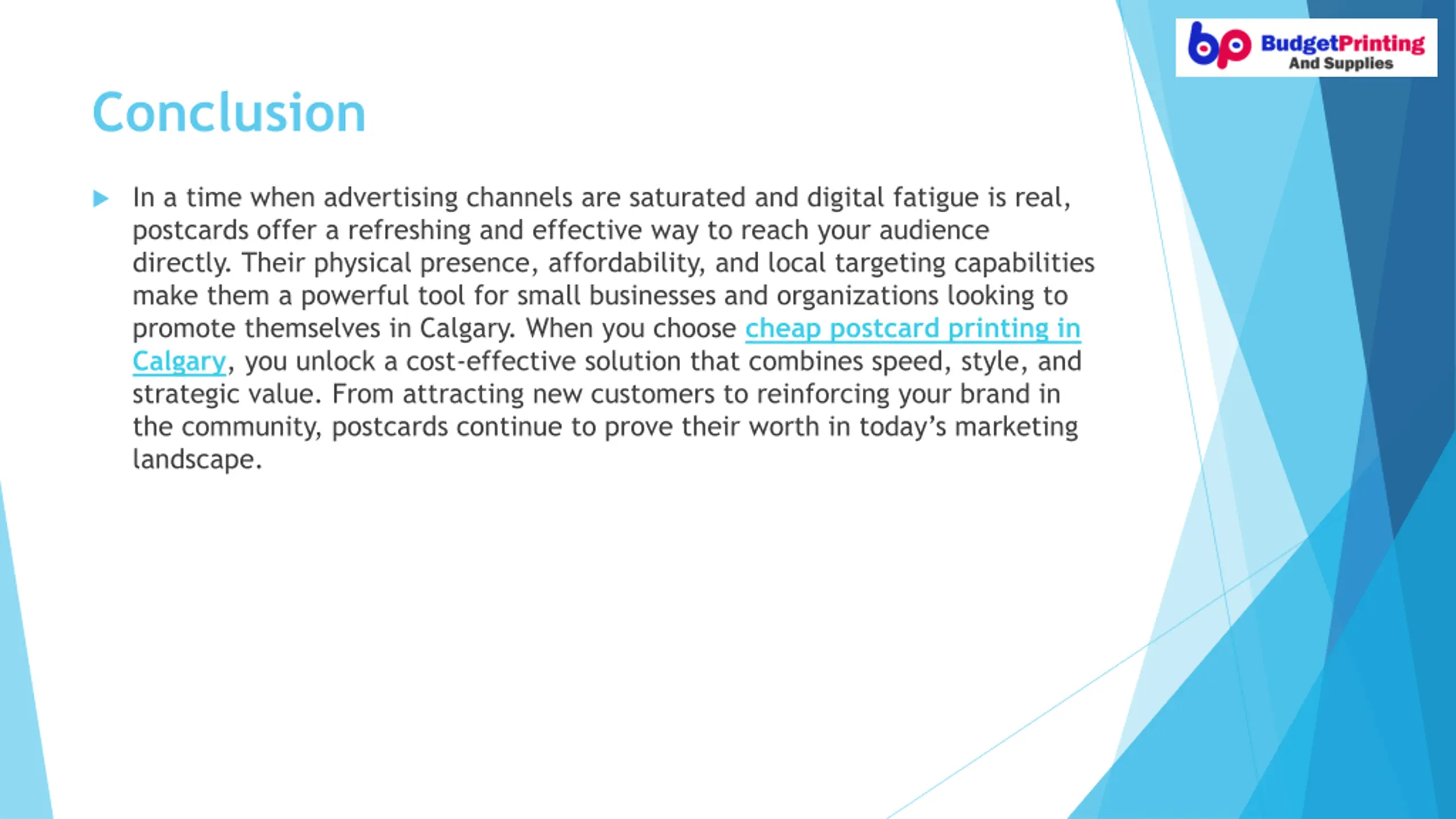Conclusion In a time when advertising channels are saturated and digital fatigue is real, postcards offer a refreshing and effective way to reach your audience directly. Their physical presence, affordability, and local targeting capabilities make them a powerful tool for small businesses and organizations looking to promote themselves in Calgary. When you choose cheap postcard printing in Calgary, you unlock a cost-effective solution that combines speed, style, and strategic value. From attracting new customers to reinforcing your brand in the community, postcards continue to prove their worth in today s marketing landscape.