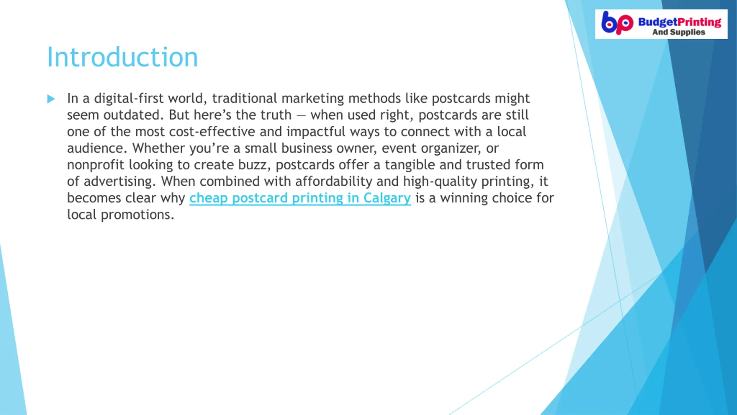 Introduction In a digital-first world, traditional marketing methods like postcards might seem outdated. But here s the truth when used right, postcards are still one of the most cost-effective and impactful ways to connect with a local audience. Whether you re a small business owner, event organizer, or nonprofit looking to create buzz, postcards offer a tangible and trusted form of advertising. When combined with affordability and high-quality printing, it becomes clear why cheap postcard printing in Calgary is a winning choice for local promotions.