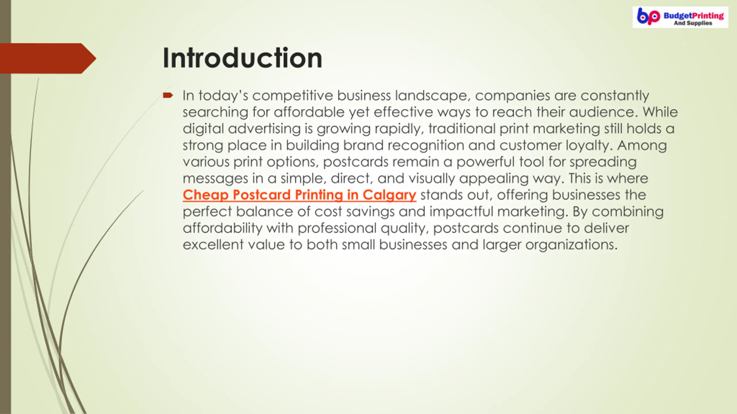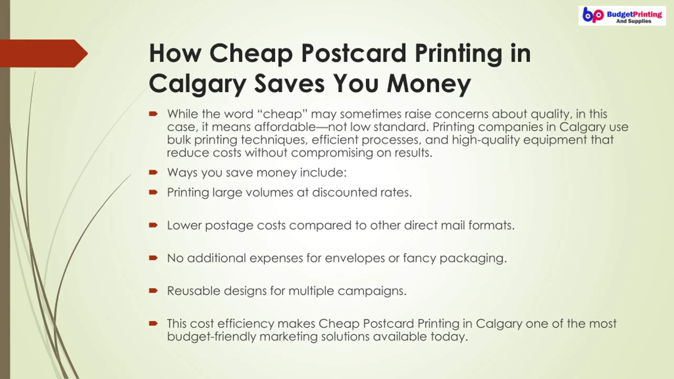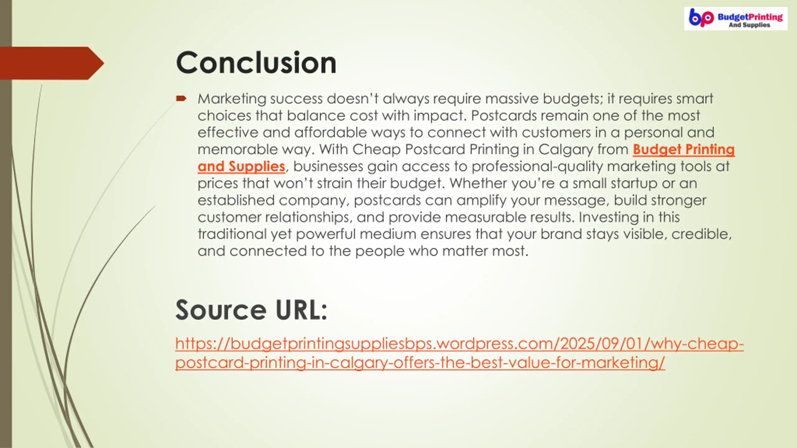 Conclusion Marketing success doesn t always require massive budgets; it requires smart choices that balance cost with impact. Postcards remain one of the most effective and affordable ways to connect with customers in a personal and memorable way. With Cheap Postcard Printing in Calgary from Budget Printing and Supplies, businesses gain access to professional-quality marketing tools at prices that won t strain their budget. Whether you re a small startup or an established company, postcards can amplify your message, build stronger customer relationships, and provide measurable results. Investing in this traditional yet powerful medium ensures that your brand stays visible, credible, and connected to the people who matter most. Source URL: https://budgetprintingsuppliesbps.wordpress.com/2025/09/01/why-cheap- postcard-printing-in-calgary-offers-the-best-value-for-marketing/