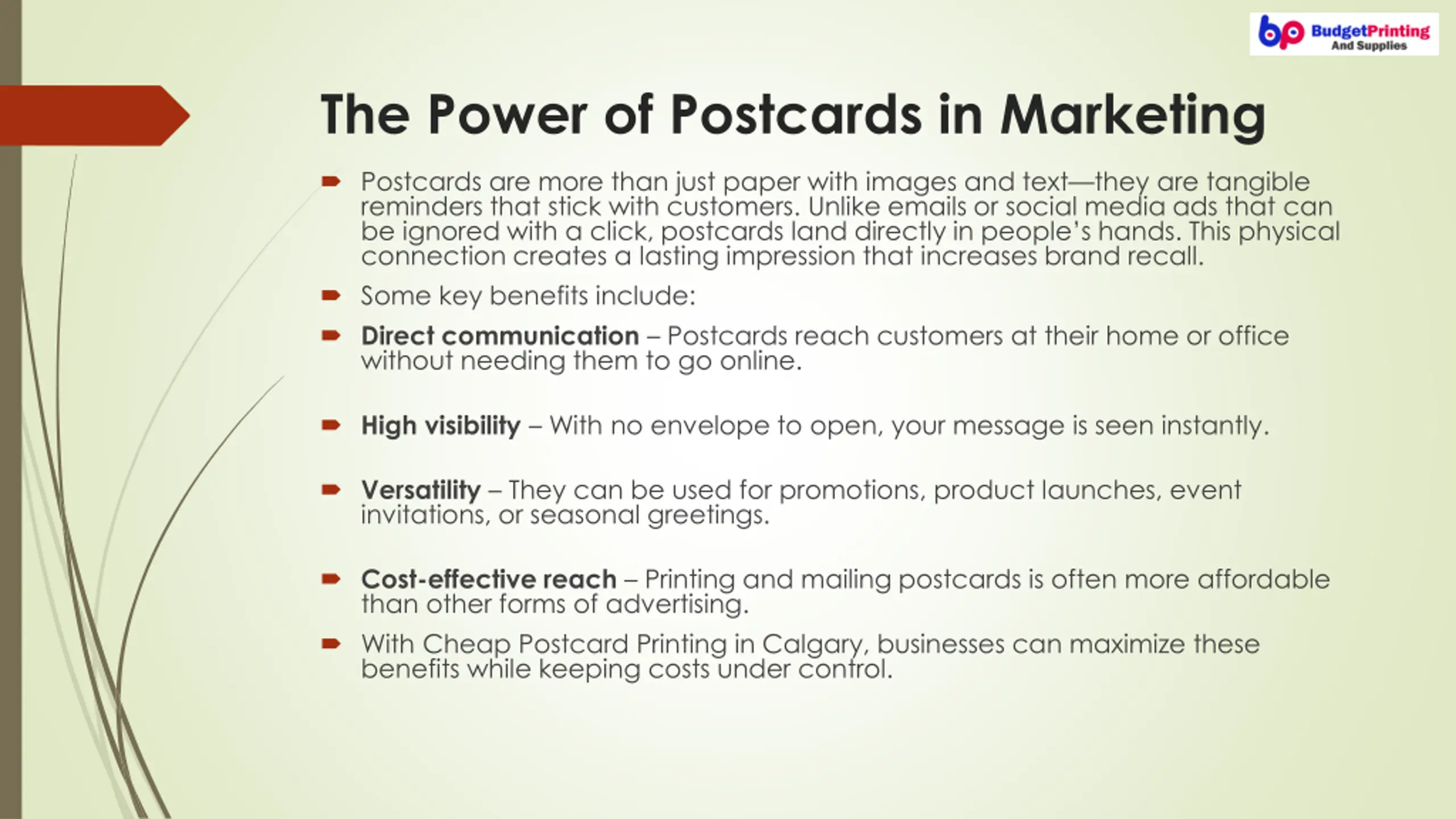 The Power of Postcards in Marketing Postcards are more than just paper with images and text they are tangible reminders that stick with customers. Unlike emails or social media ads that can be ignored with a click, postcards land directly in people s hands. This physical connection creates a lasting impression that increases brand recall. Some key benefits include: Direct communication Postcards reach customers at their home or office without needing them to go online. High visibility With no envelope to open, your message is seen instantly. Versatility They can be used for promotions, product launches, event invitations, or seasonal greetings. Cost-effective reach Printing and mailing postcards is often more affordable than other forms of advertising. With Cheap Postcard Printing in Calgary, businesses can maximize these benefits while keeping costs under control.