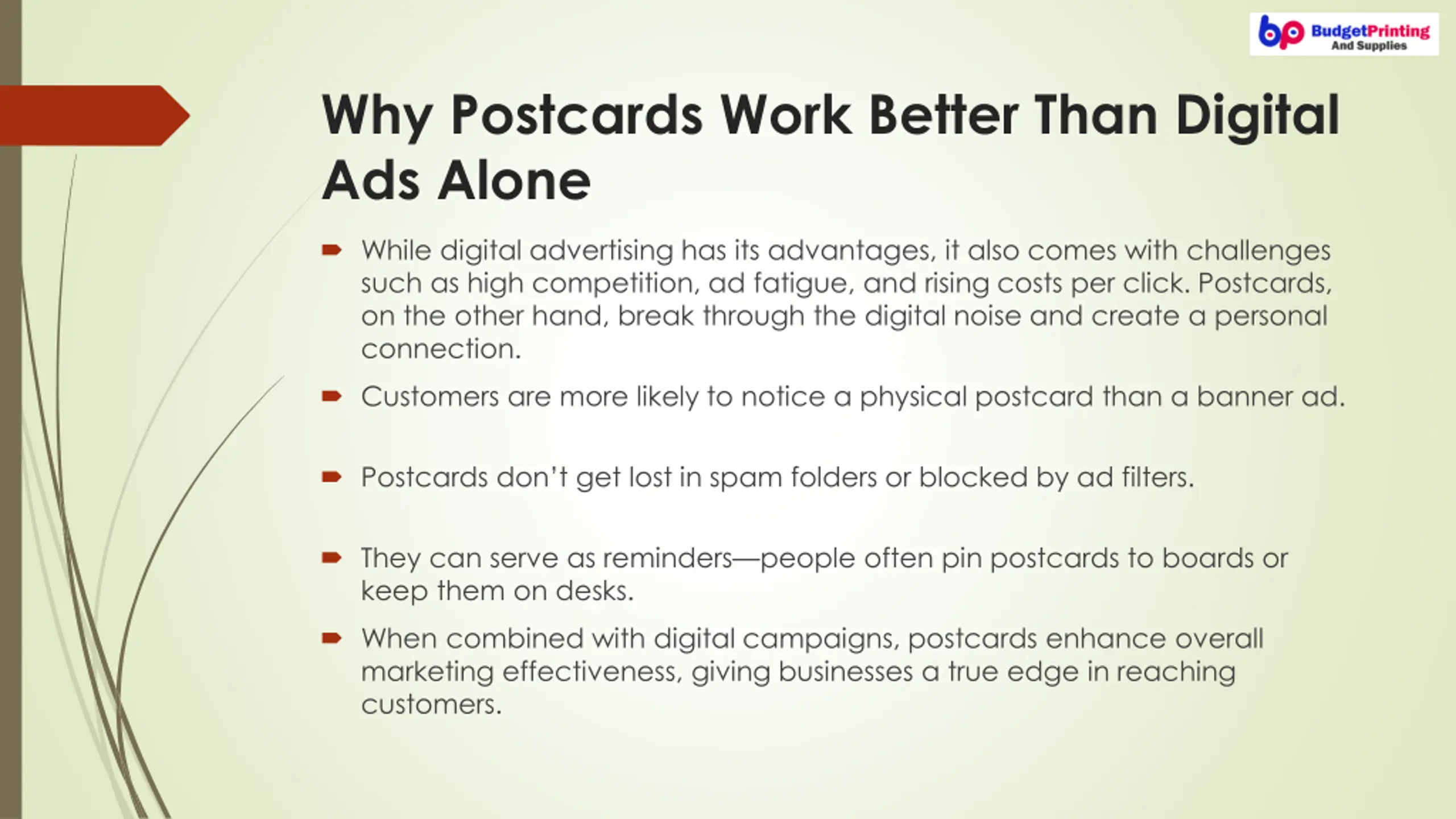 Why Postcards Work Better Than Digital Ads Alone While digital advertising has its advantages, it also comes with challenges such as high competition, ad fatigue, and rising costs per click. Postcards, on the other hand, break through the digital noise and create a personal connection. Customers are more likely to notice a physical postcard than a banner ad. Postcards don t get lost in spam folders or blocked by ad filters. They can serve as reminders people often pin postcards to boards or keep them on desks. When combined with digital campaigns, postcards enhance overall marketing effectiveness, giving businesses a true edge in reaching customers.